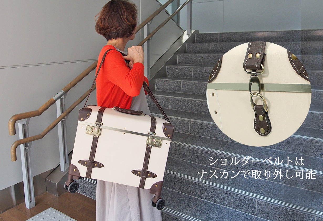 階段などに便利な取り外し可能のショルダーベルト付き。