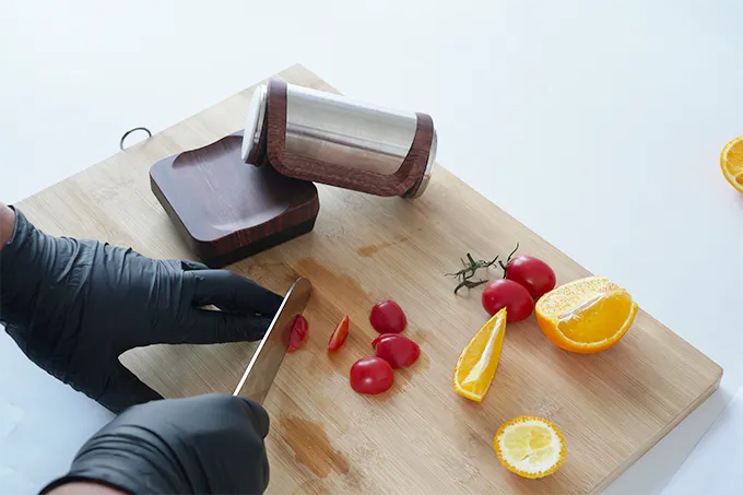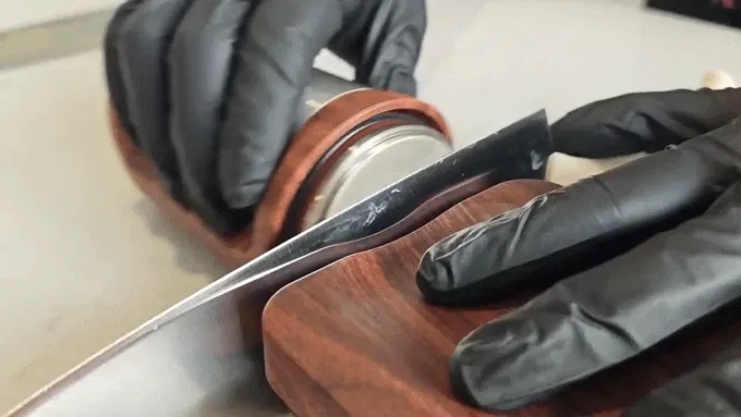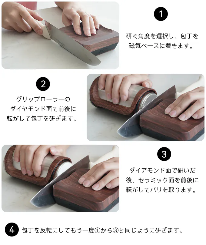 包丁を動かさず、刃をベースに磁気で固定し、ローラーを前後に転がすだけで研いでいきます。