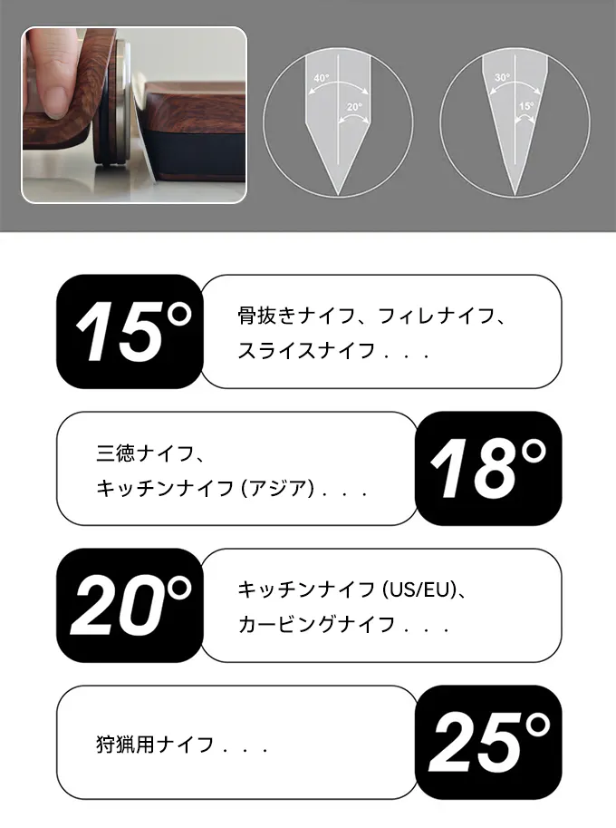 ・【4つの角度で】15・18・20・25°の角度を搭載!あらゆるナイフに対応