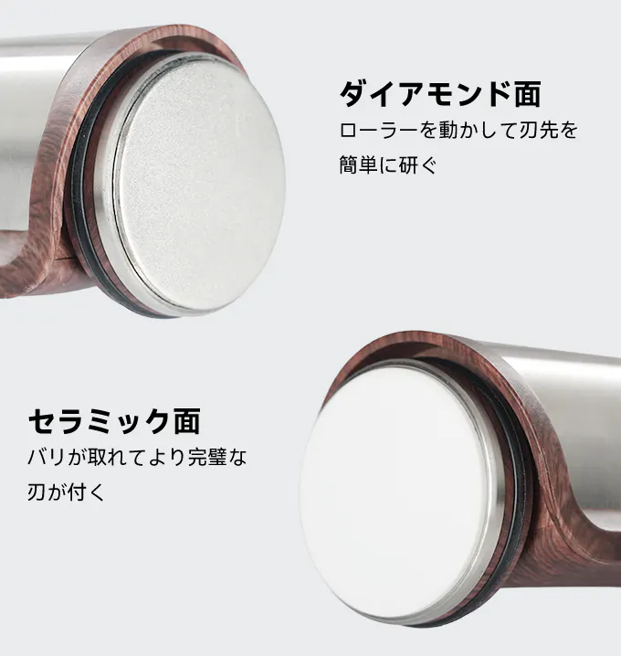 「ROLLING H1304P」は研削能力の優れたダイヤモンド砥石と刃の先端を整える細かいセラミック砥石が搭載されています。