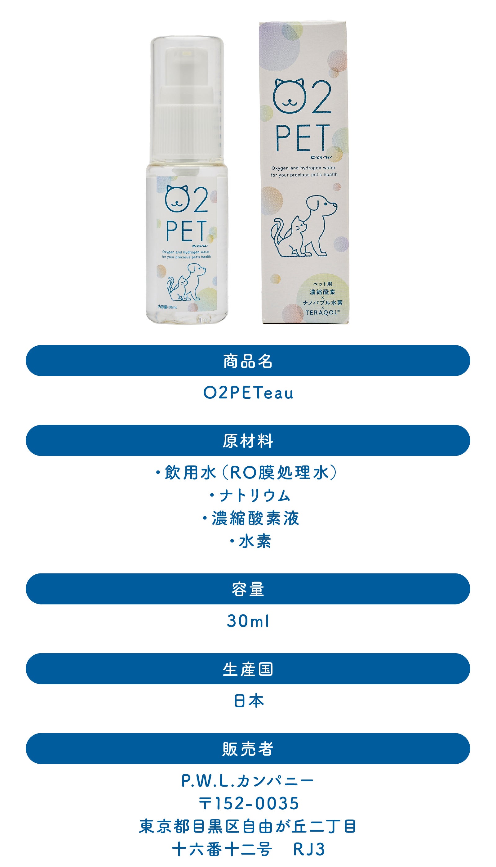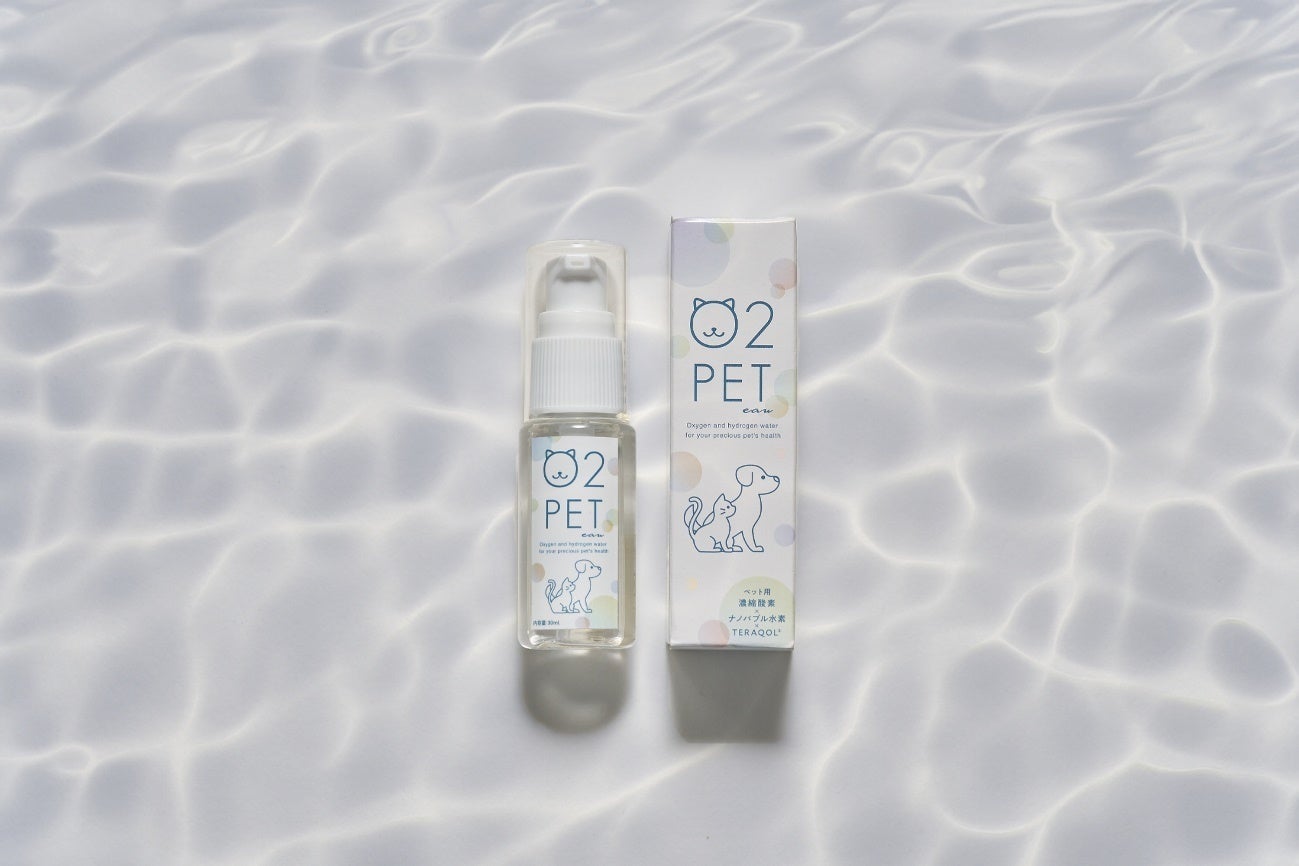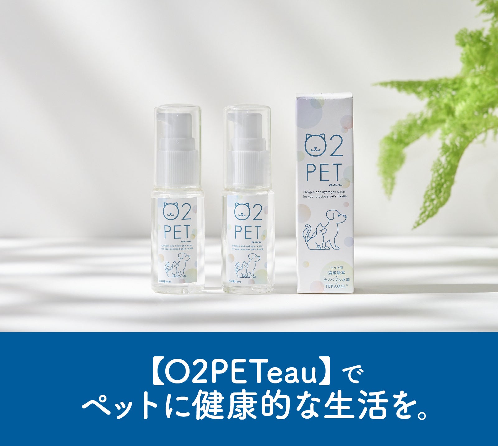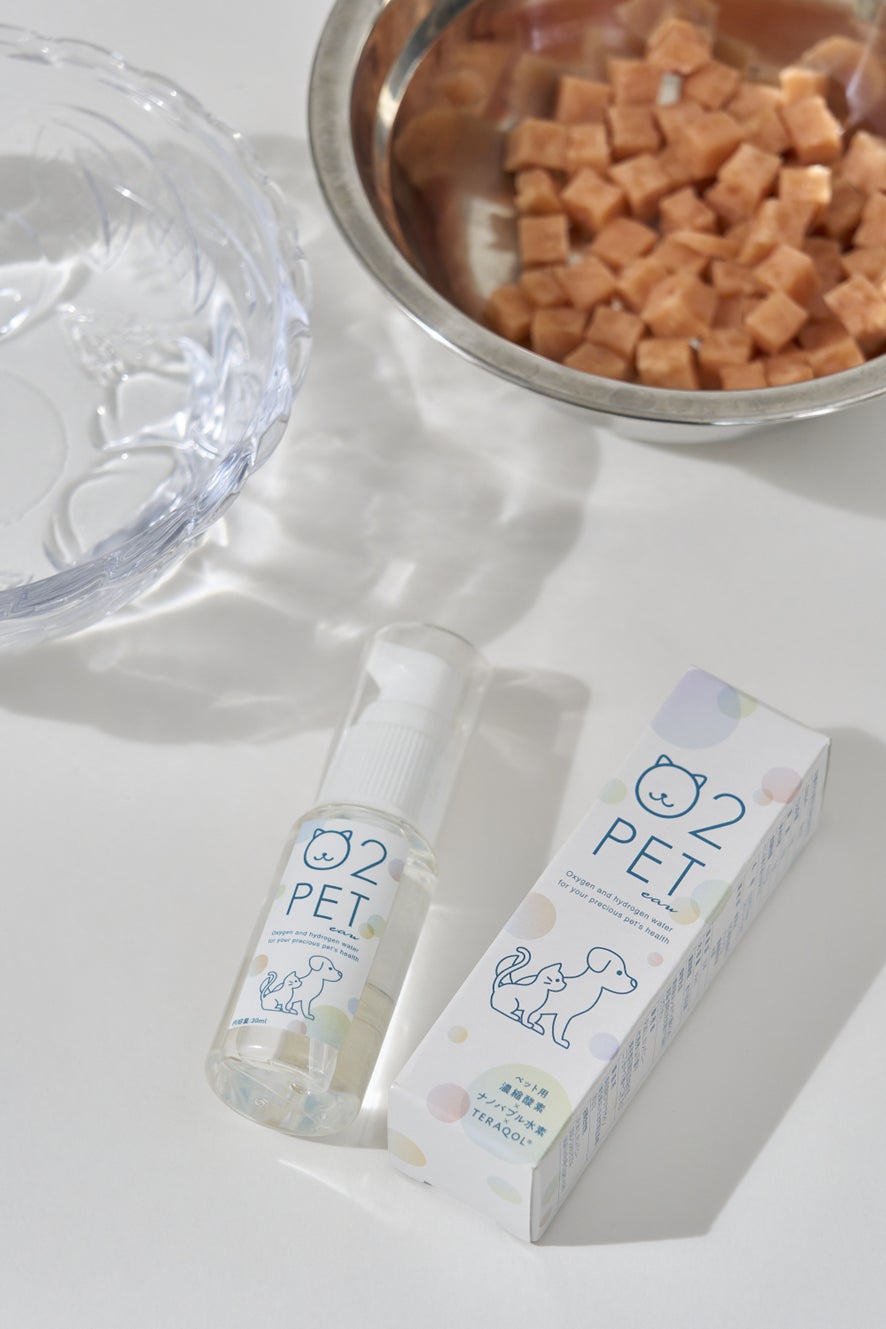 A:O2PETeauは、濃縮酸素水です。水に高濃度の酸素を溶かし込んだ製品で、ペットの酸素の補給をサポートするために開発されました。さらにナノバブル水素も添加されています。