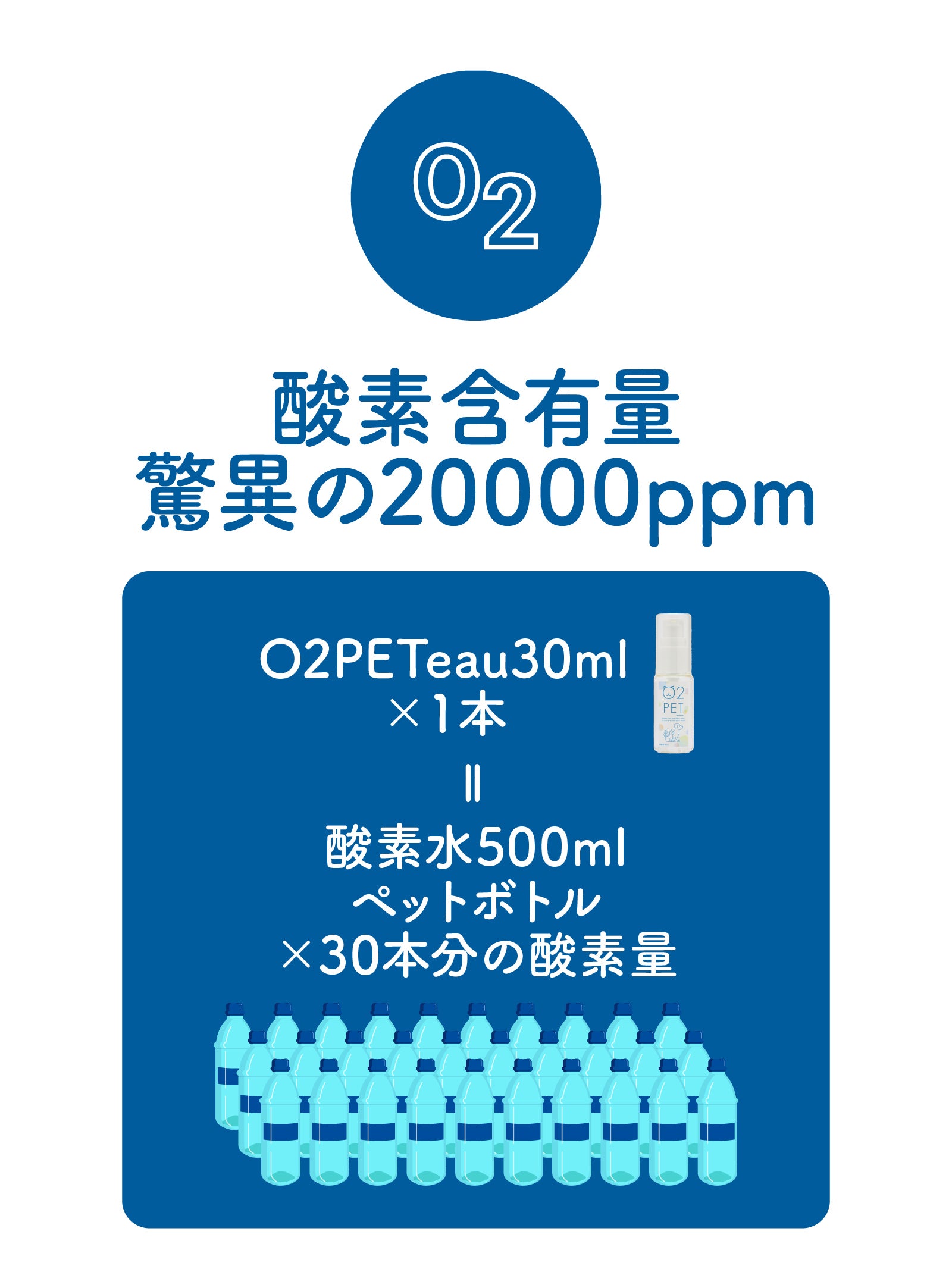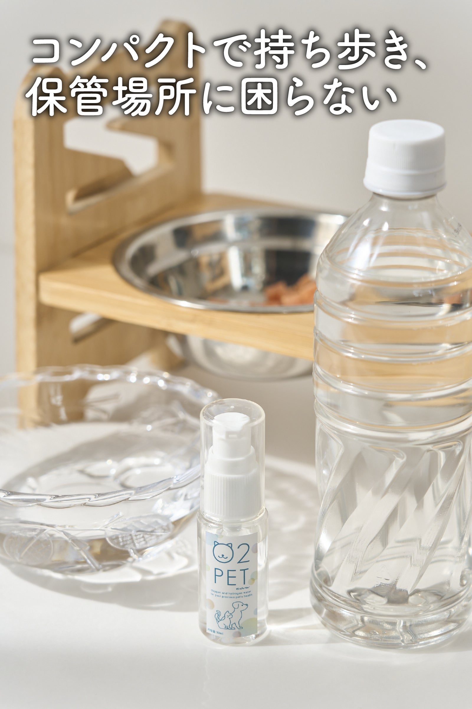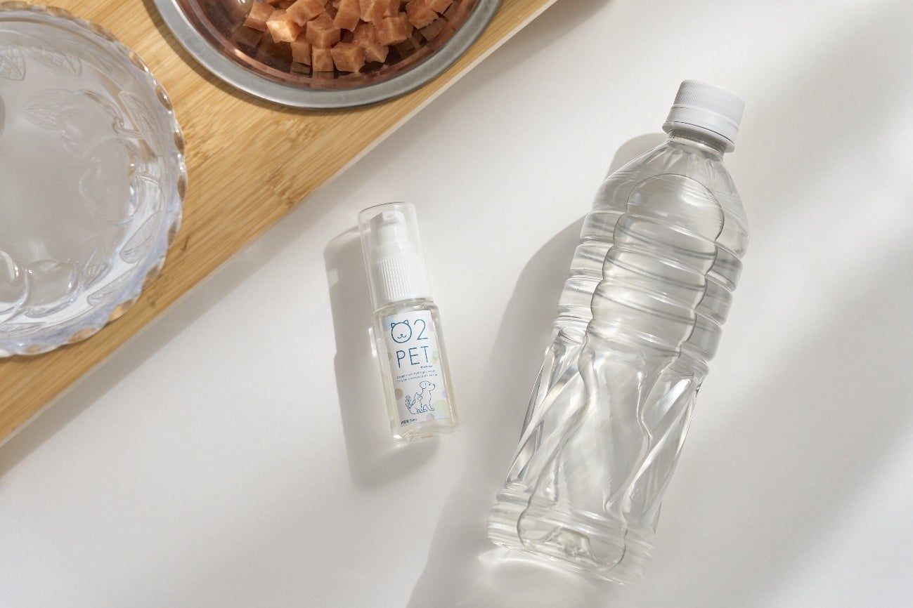 1本で一般の酸素水や水素水のペットボトル30本分の酸素と水素を含有し、1日2~3回、2~3プッシュ分をペットに与えるだけで、手軽に酸素と水素の補給ができます。