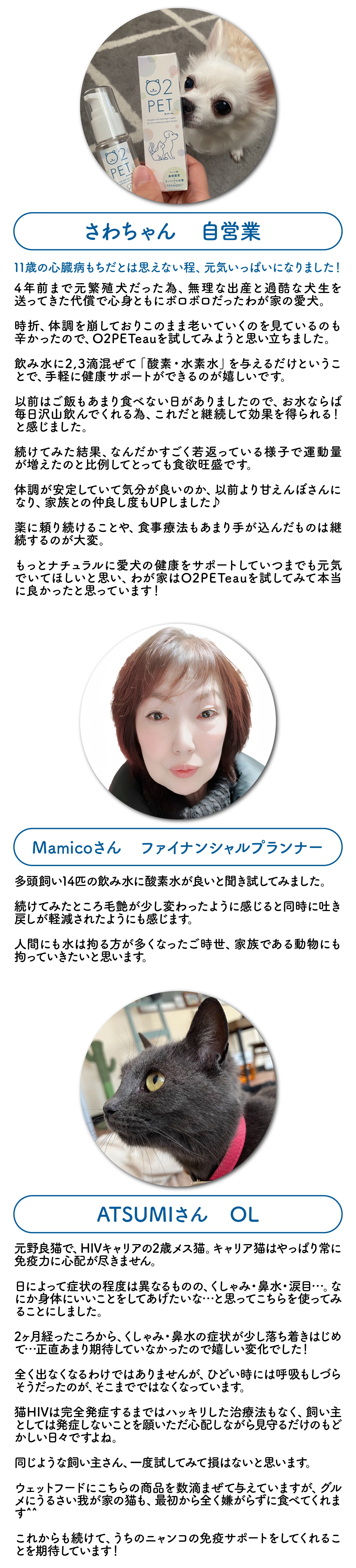 A:犬、猫、その他の小動物に適しています。ただし、胃酸に反応して酸素が発生しますので、胃酸を分泌しない生物には適しません。特に高齢のペットや体力が低下しているペットにおすすめです。