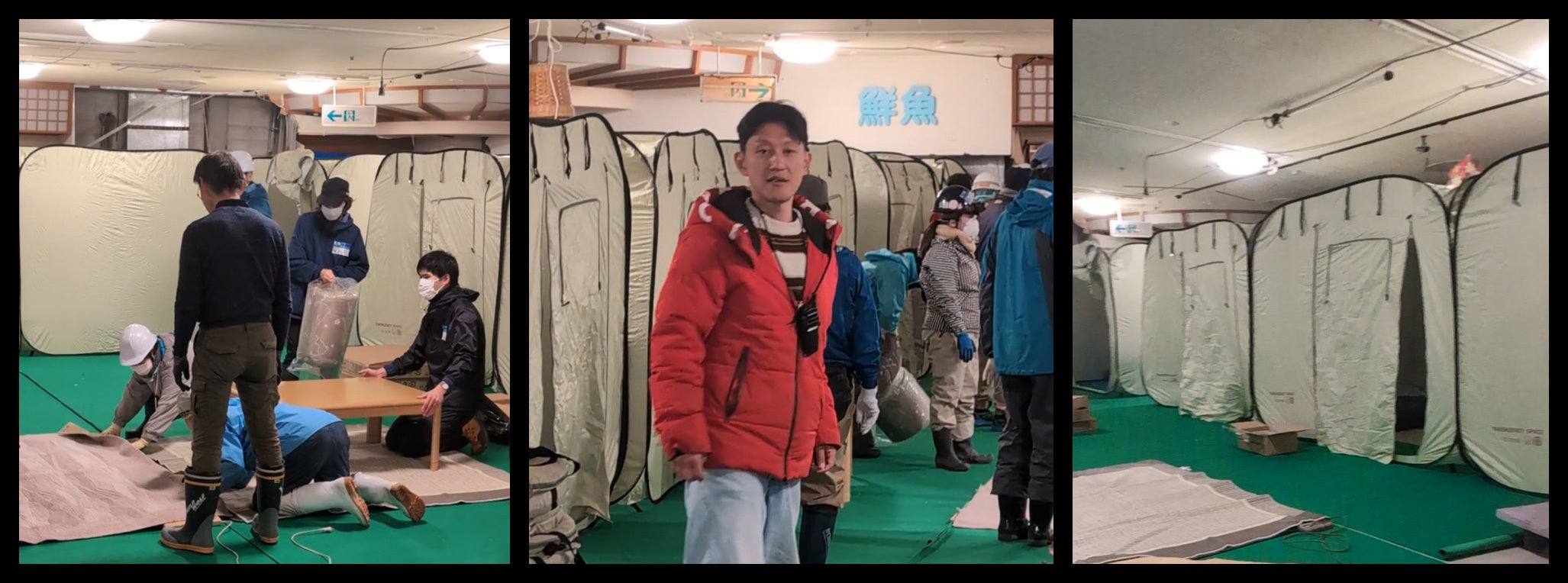 取り急ぎではありますがスーパー内の空スペースにテントを用意し休憩していただけるスペースを設けましたが、まだトイレも仮設で浴室もありません。