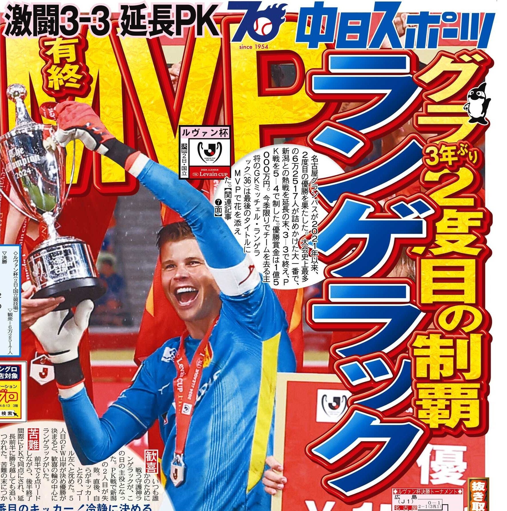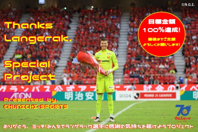 そんな我らの守護神が、2024年シーズン限りで名古屋グランパスを退団します。多くのグランパスファミリーに興奮を与えてきたその勇姿を見られなくなることは残念ですが、ランゲラック選手への感謝の気持ちを届けるため、今シーズン最終戦12月8日の中日スポーツにて記念特集を掲載し、盛大に送別する特別プロジェクトを実施します。今年で創刊70周年を迎える中日スポーツが、全力でランゲラック選手を応援します。