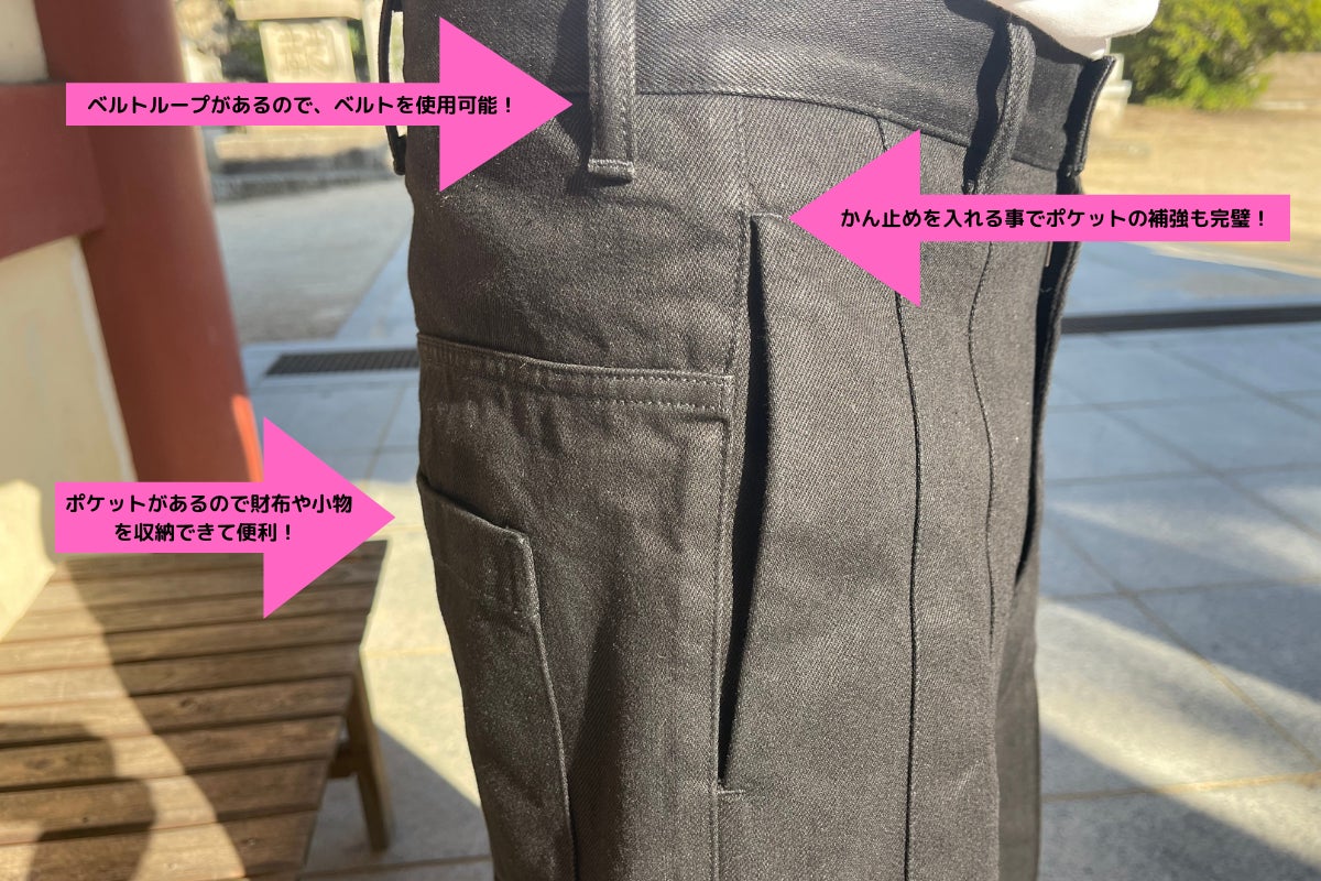 A.私たちが手掛ける『revival 袴』は、美しい袴の形を残し現代のファッションの機能性をミックスさせる事で、スタイリッシュなデザインに変え、カジュアルにもフォーマルにも合うデザインに一新させました。本来、袴には無い部分としてファスナーやポケット、ベルトループを追加する事で日常で気軽に使って頂けるデザインに再構築した製品です。