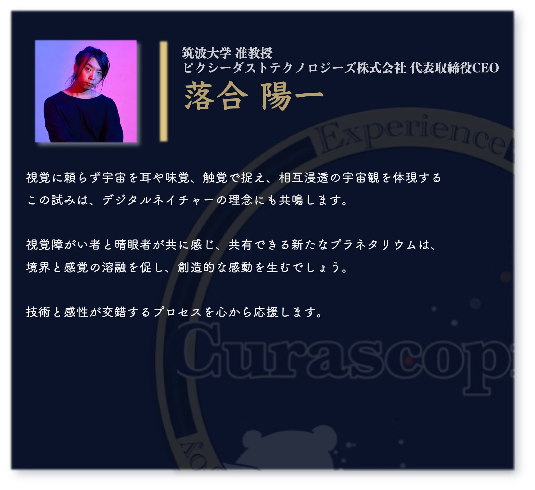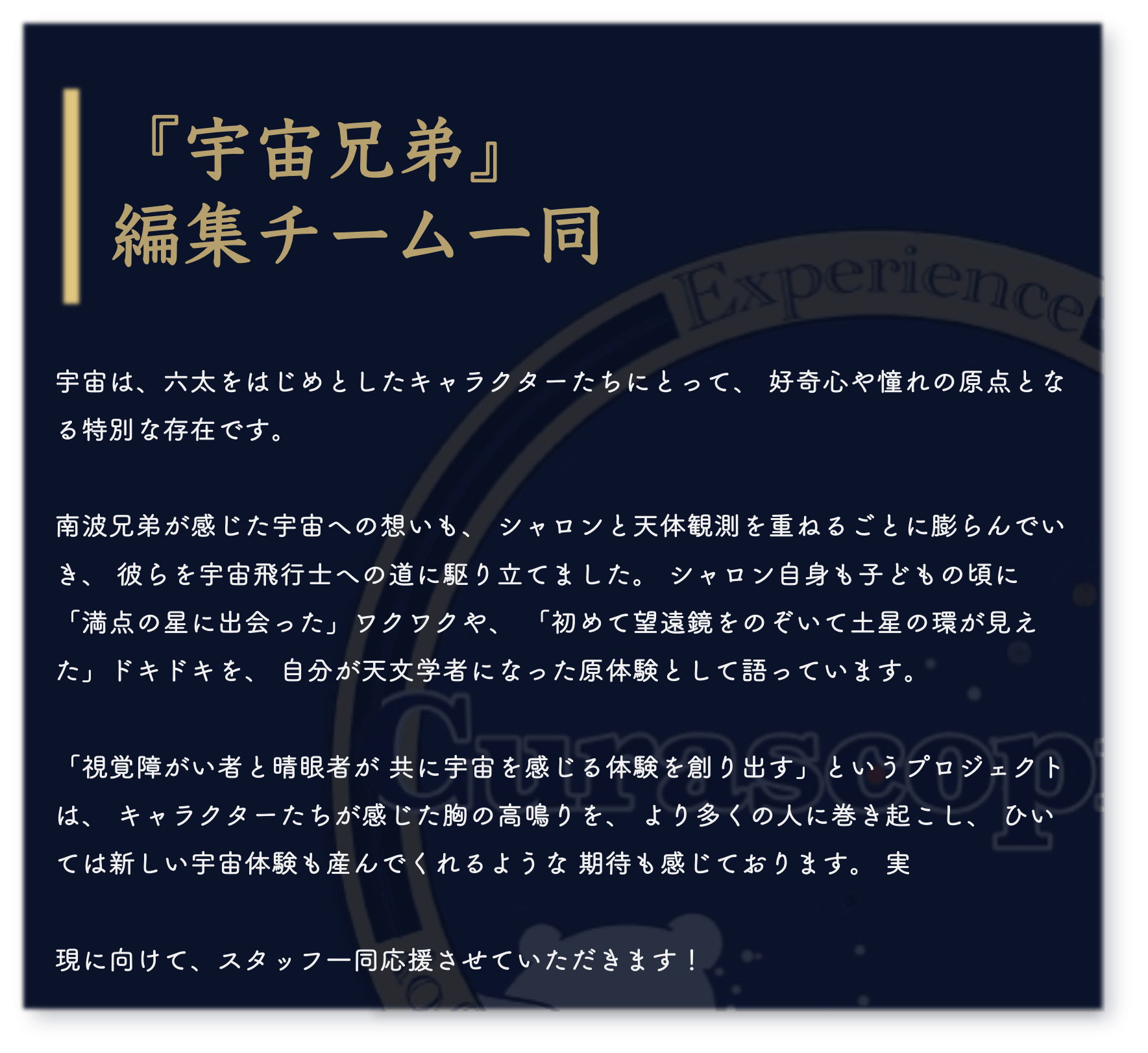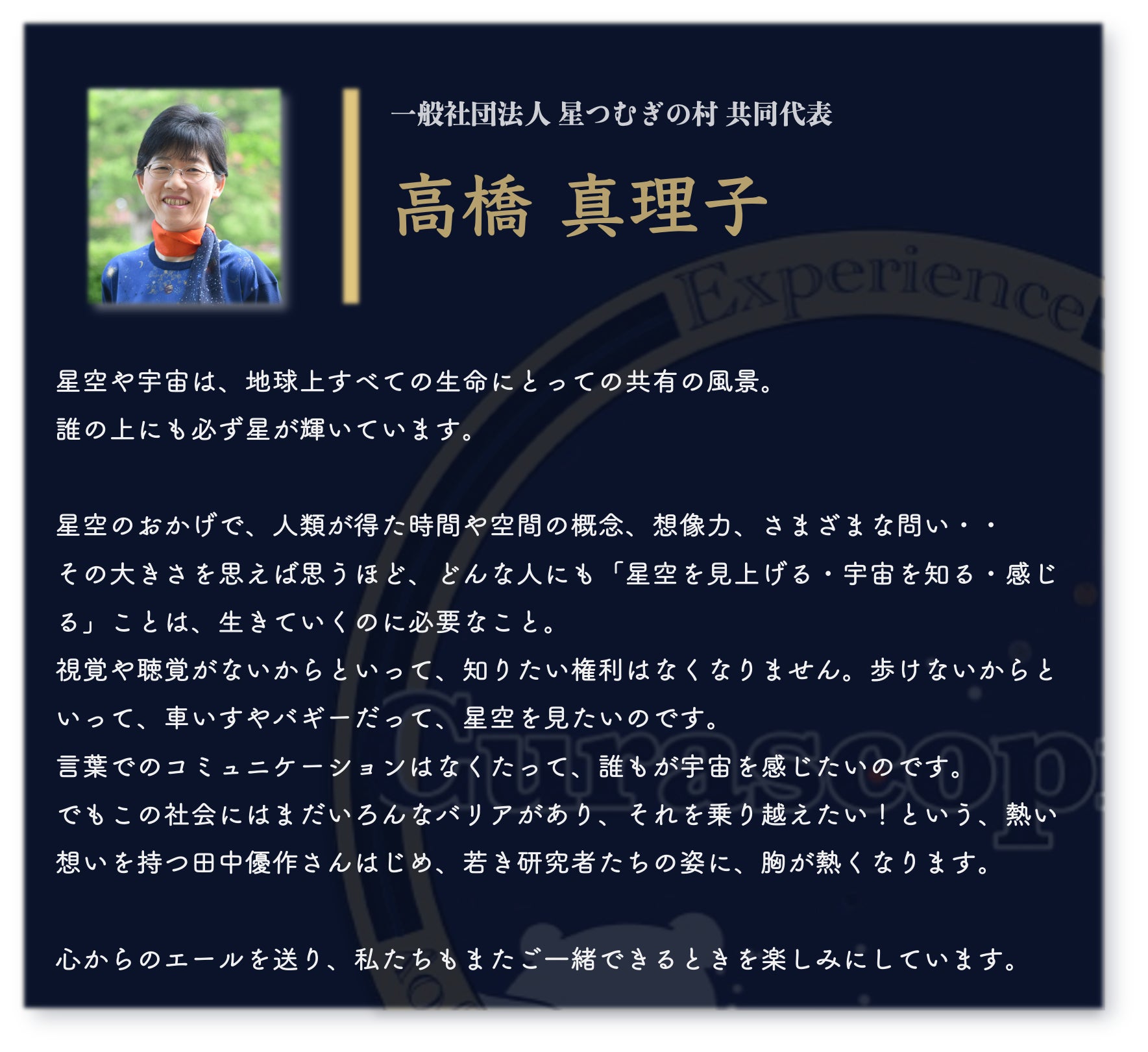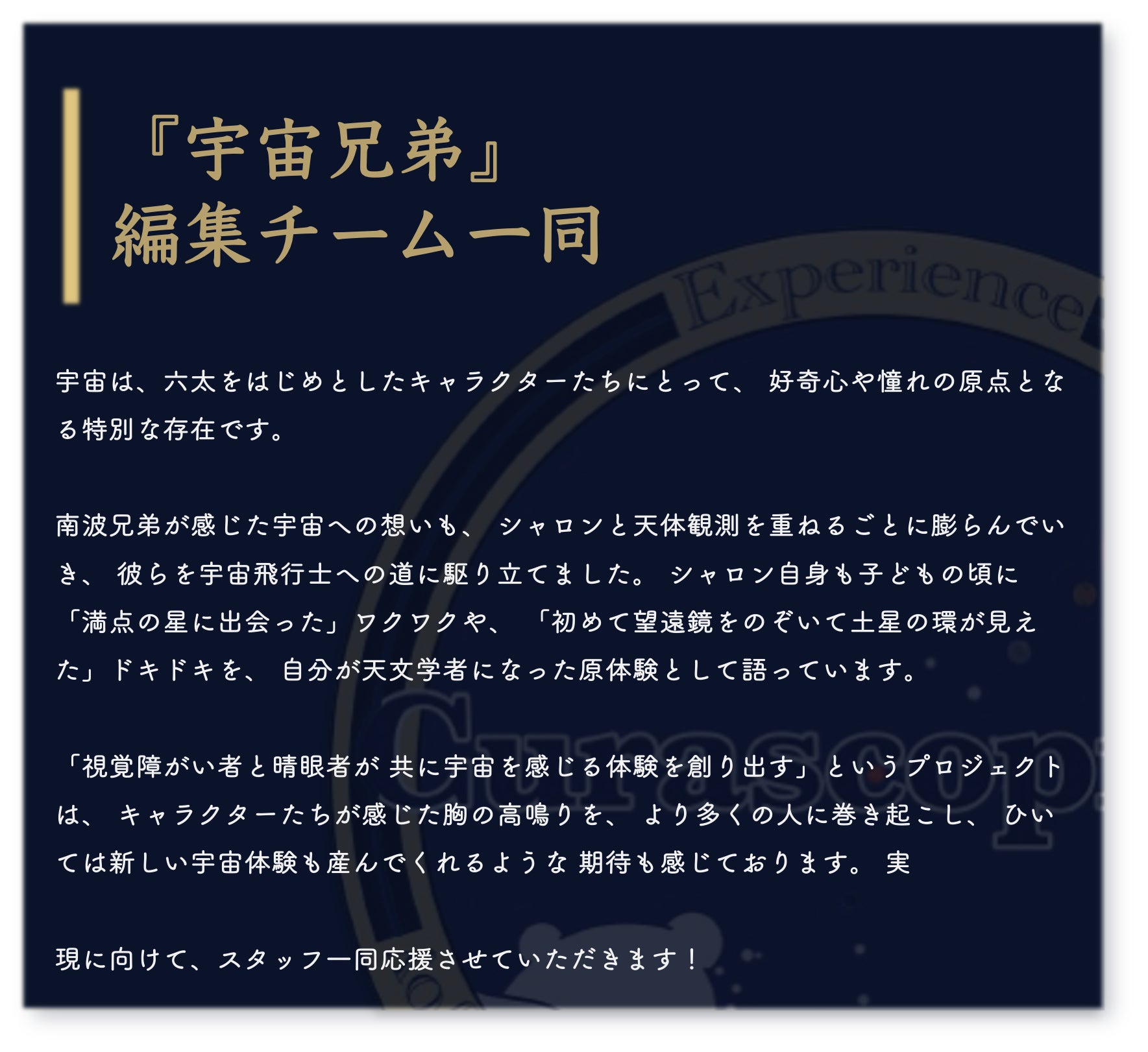 宇宙は、誰にとっても広がりと可能性の象徴です。その美しさを、視覚だけに縛られず、全ての感覚で楽しむ未来を一緒に作りませんか?
