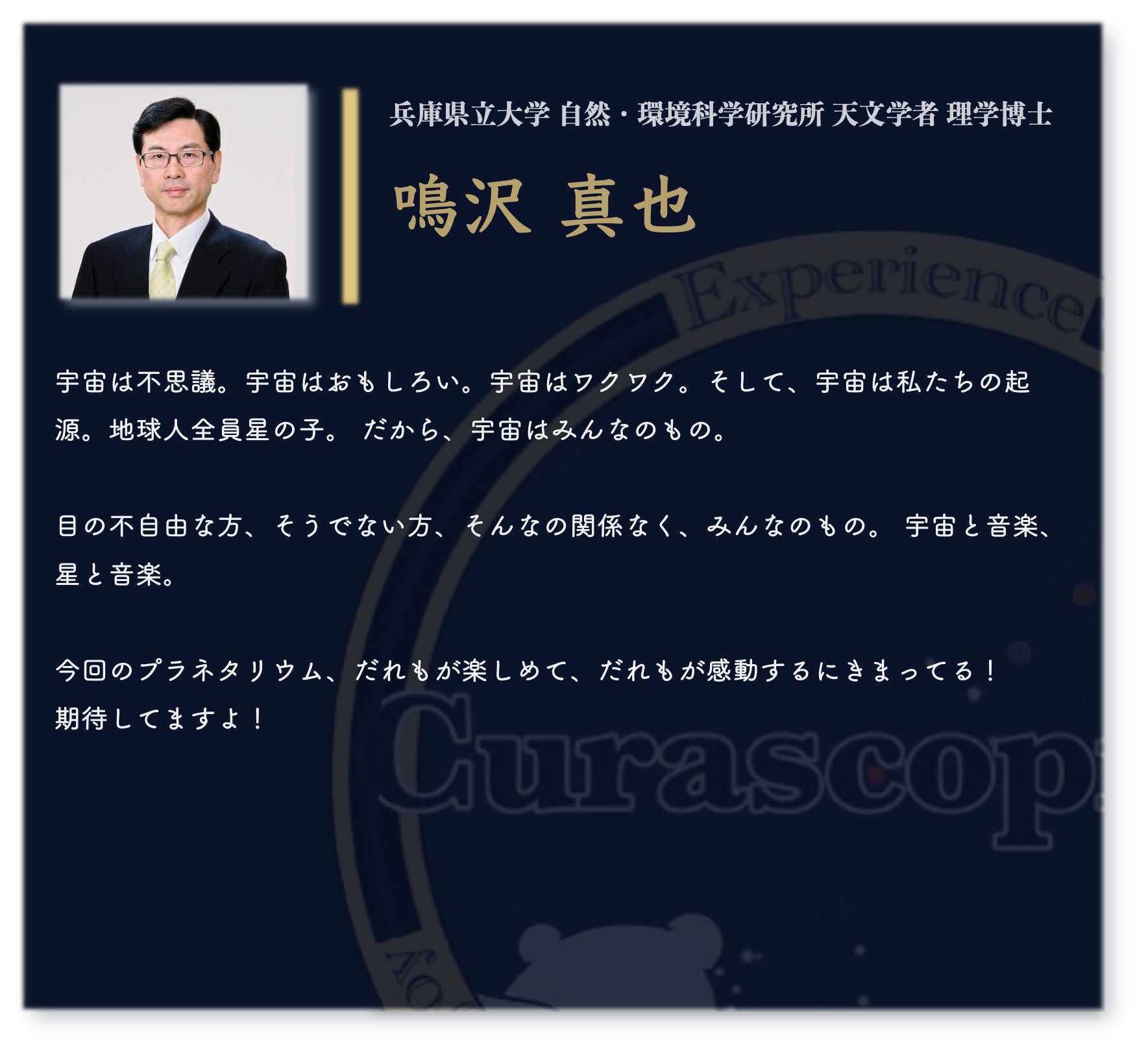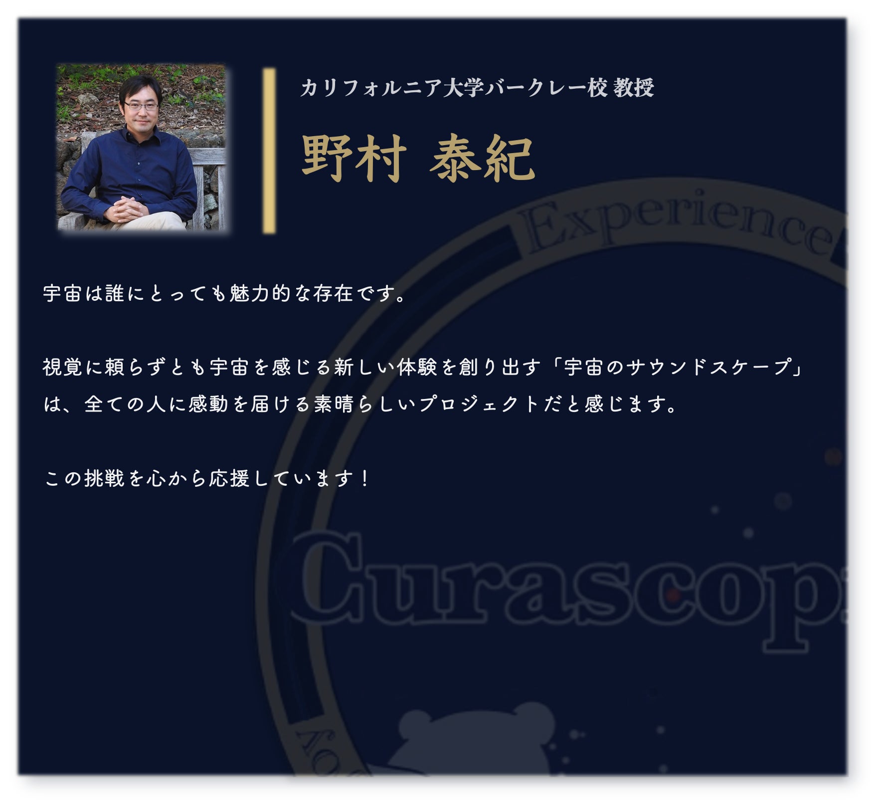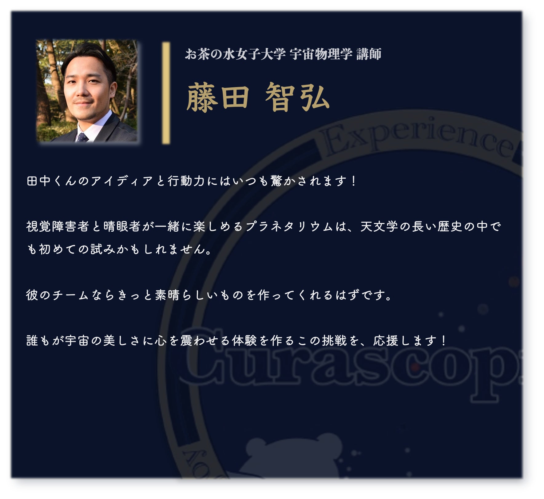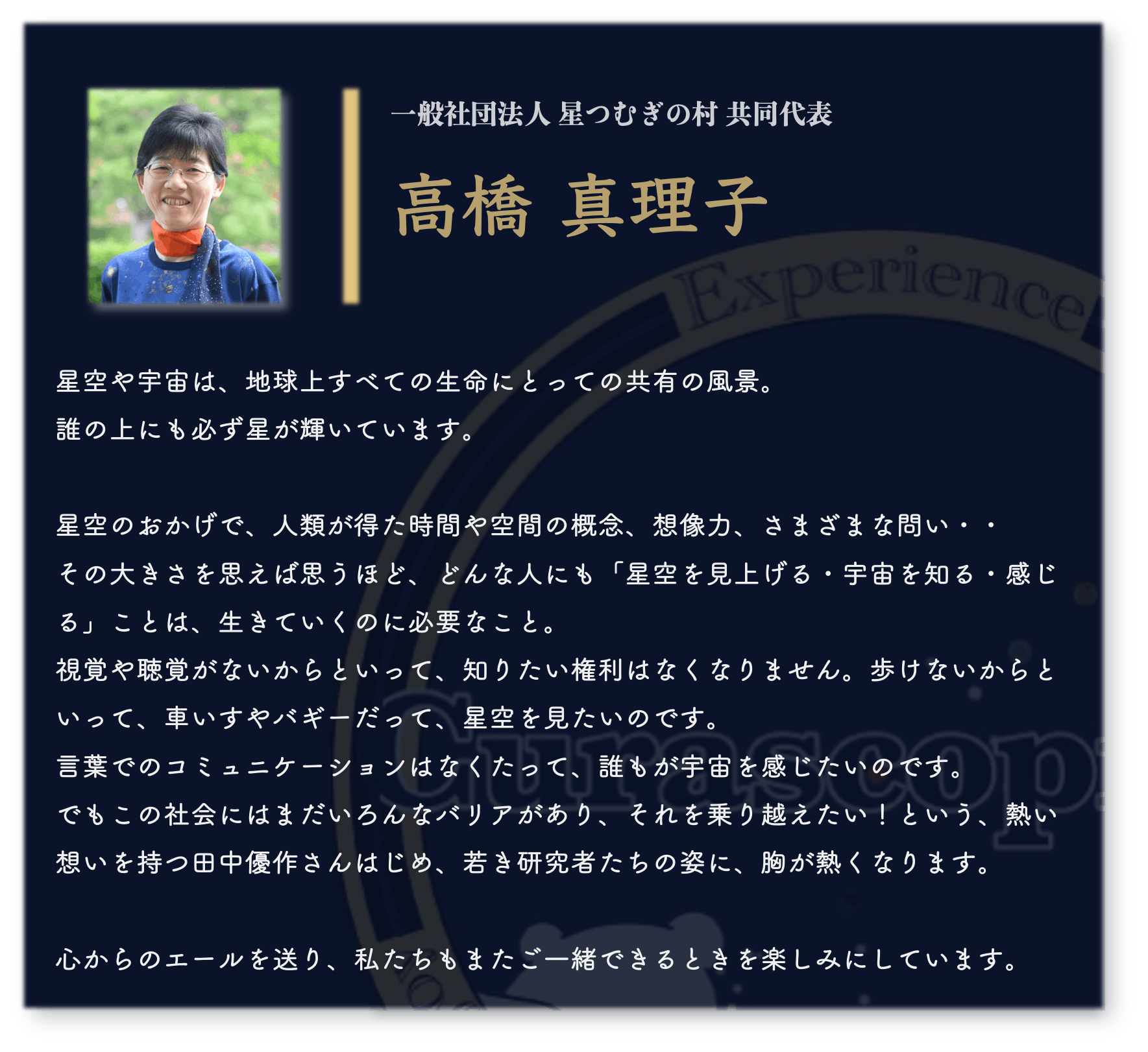 宇宙は、誰にとっても広がりと可能性の象徴です。その美しさを、視覚だけに縛られず、全ての感覚で楽しむ未来を一緒に作りませんか?