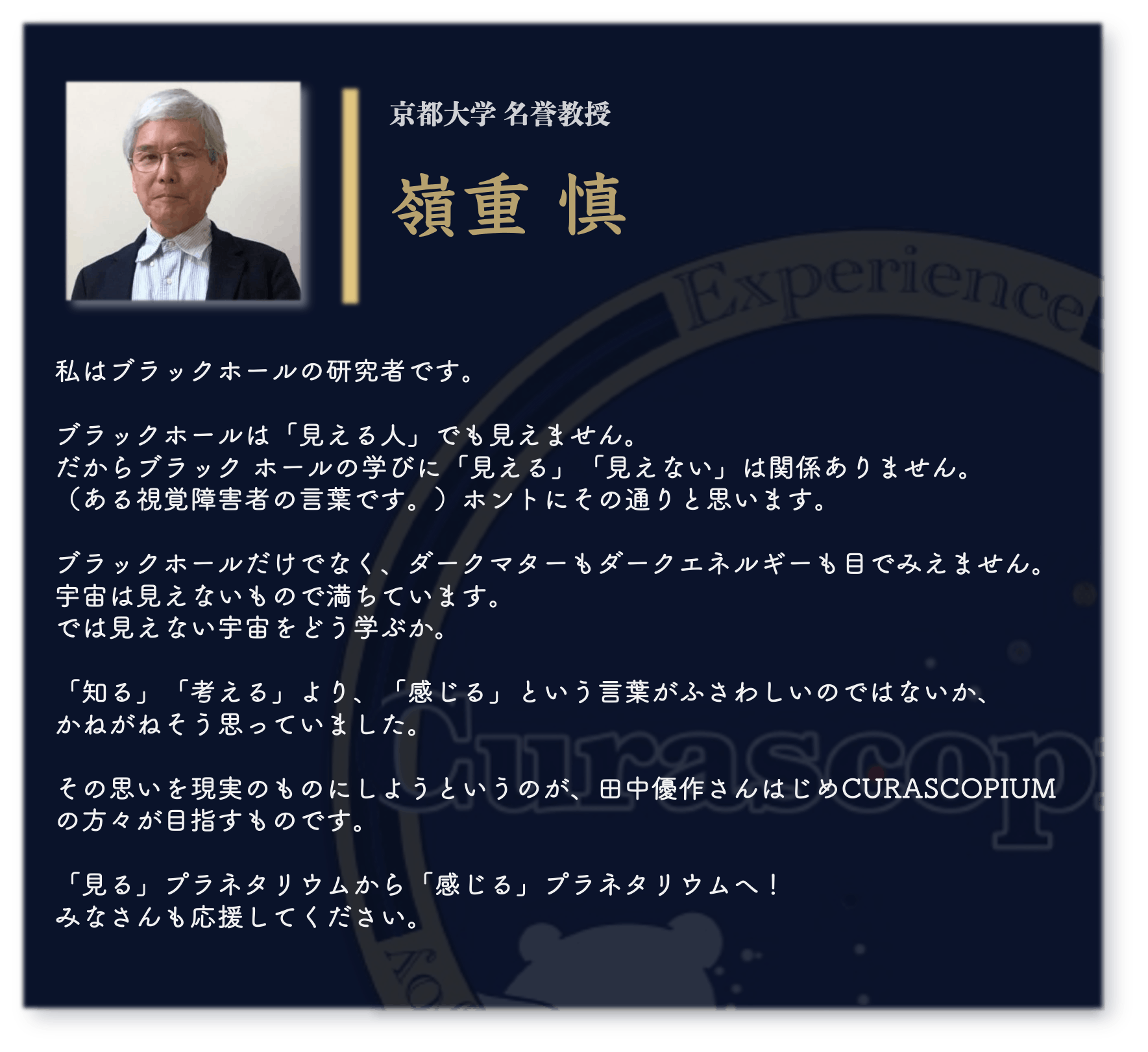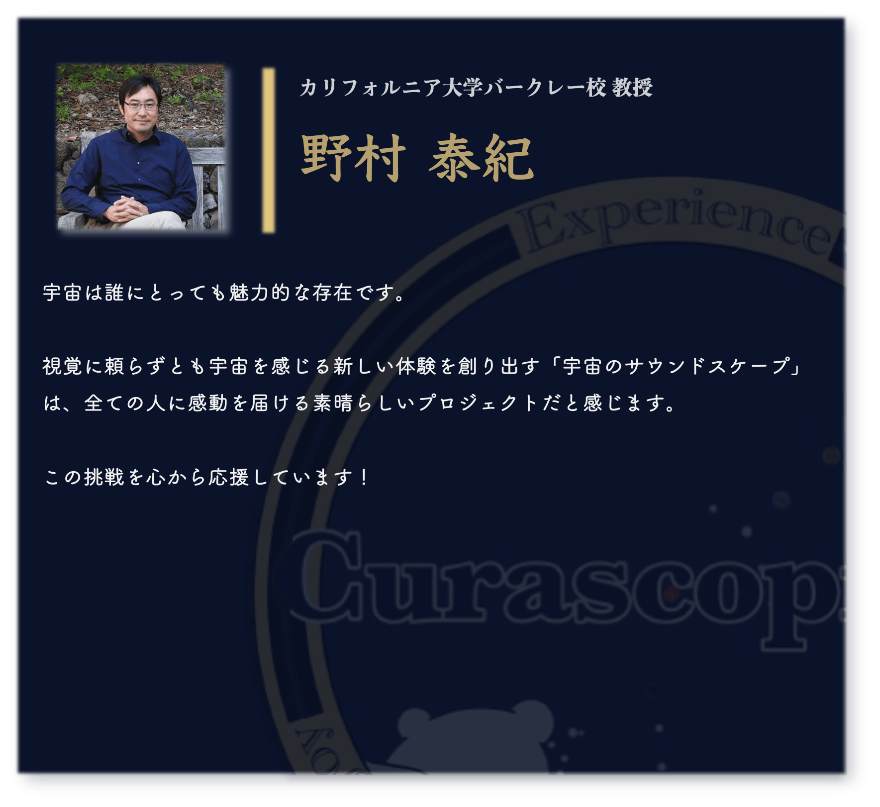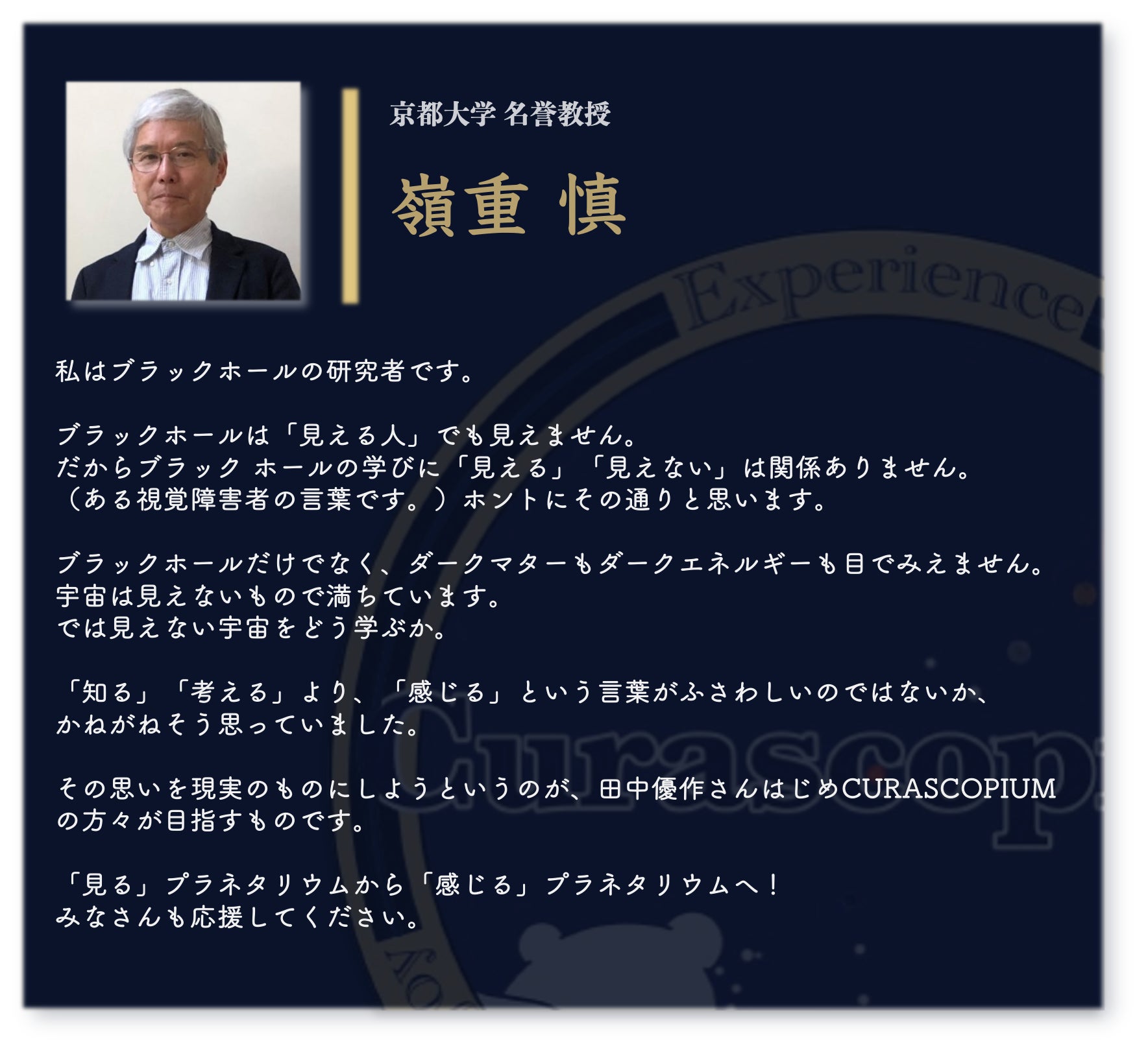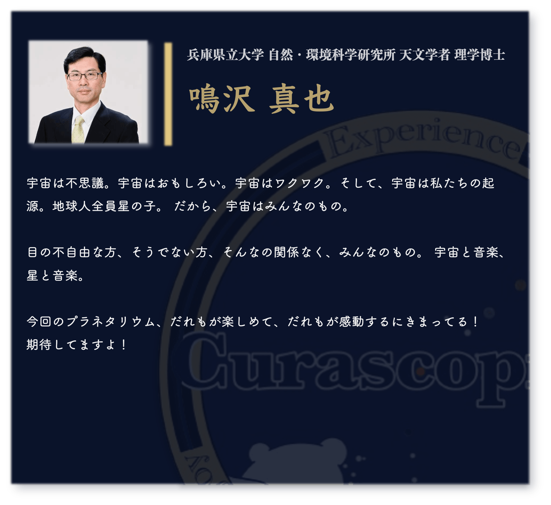 宇宙は、誰にとっても広がりと可能性の象徴です。その美しさを、視覚だけに縛られず、全ての感覚で楽しむ未来を一緒に作りませんか?