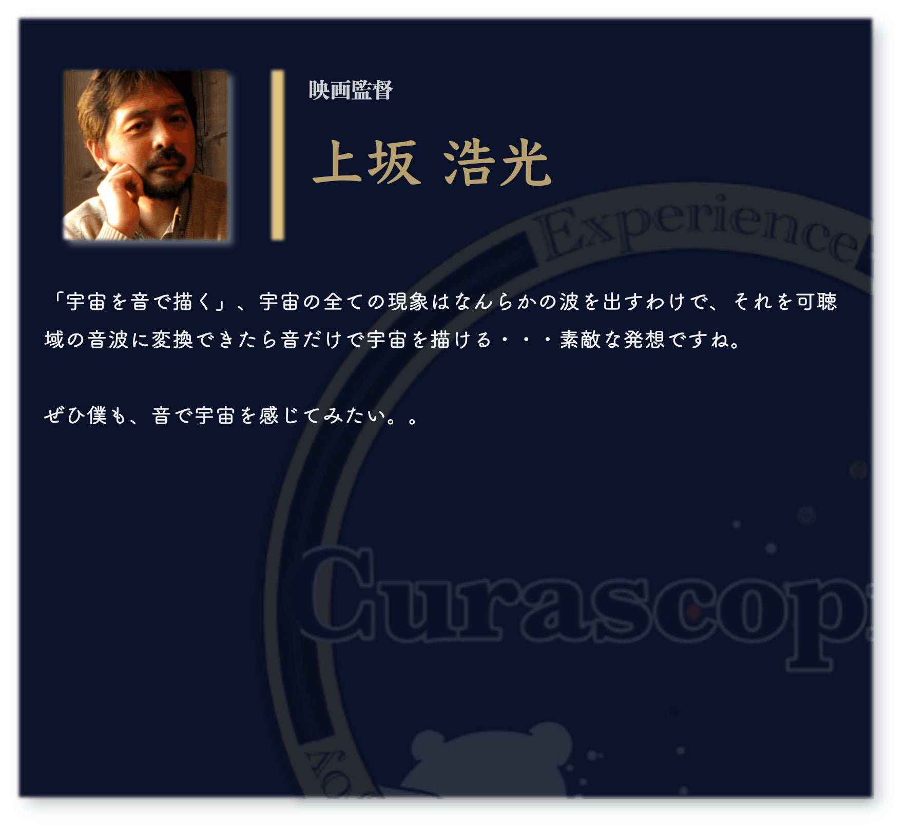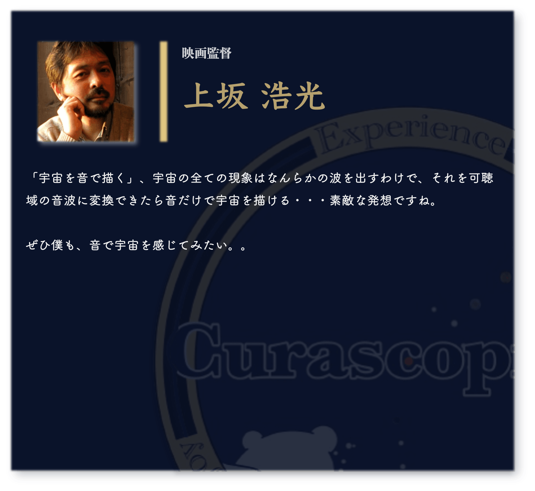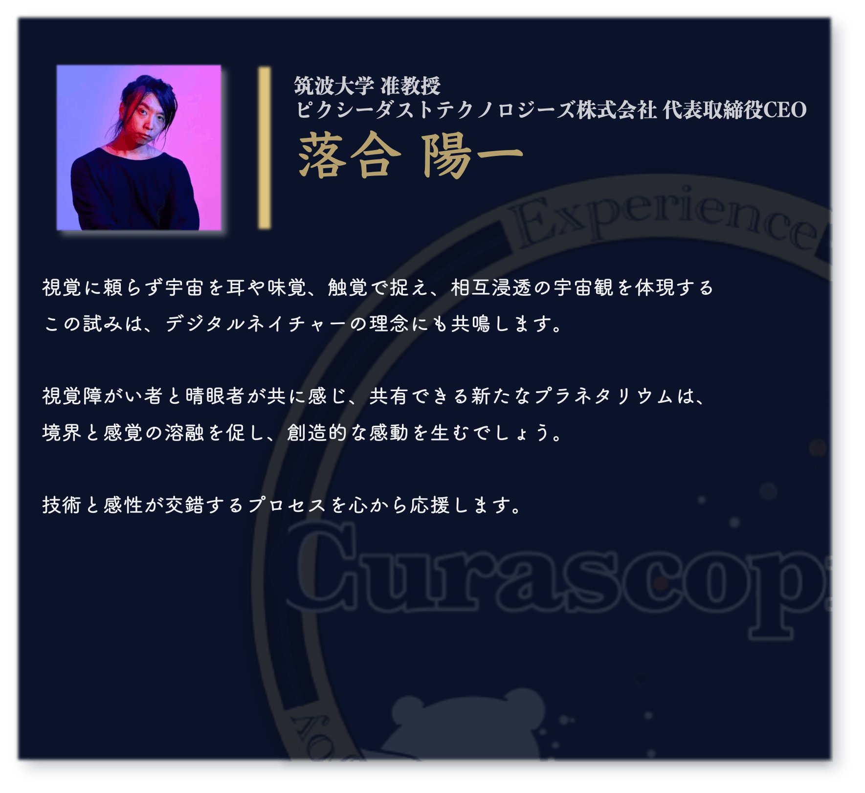 このプラネタリウムは、宇宙を「見る」のではなく、耳で「感じる」体験を提供します。すべての訪問者が視覚を超えて感じる新たな宇宙の魅力。私たちは、この体験を通じて、宇宙の素晴らしさをすべての人に届けたいと考えています。
