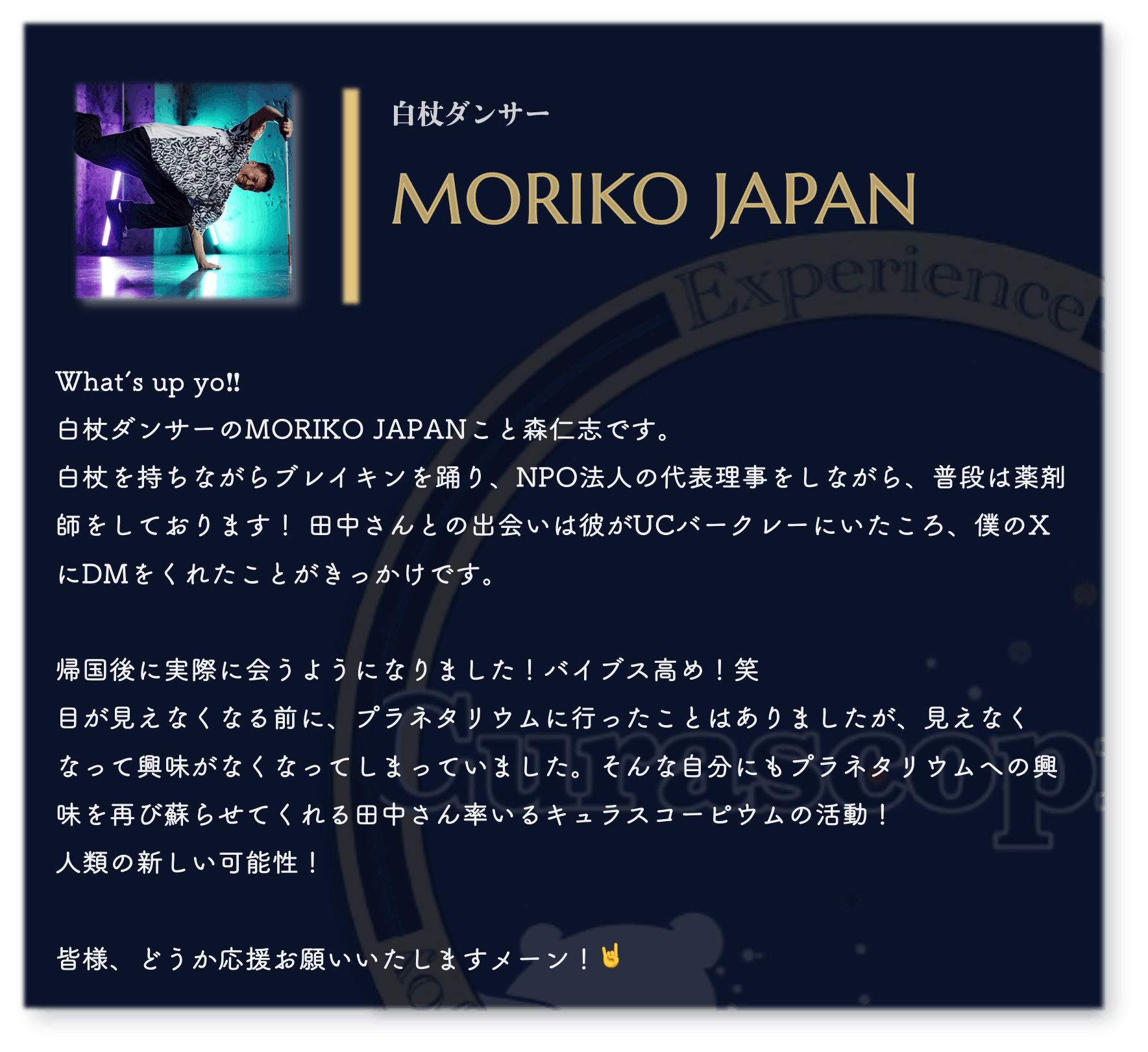 私は、自分が歩んできた道と多くの出会いを通じて、「誰もが平等に感動を共有できる場を作りたい」という想いを強く抱いています。このプラネタリウムプロジェクトは、その想いを実現するための一歩です。私は、この夢を多くの人と共有し、実現に向けて邁進していきます。