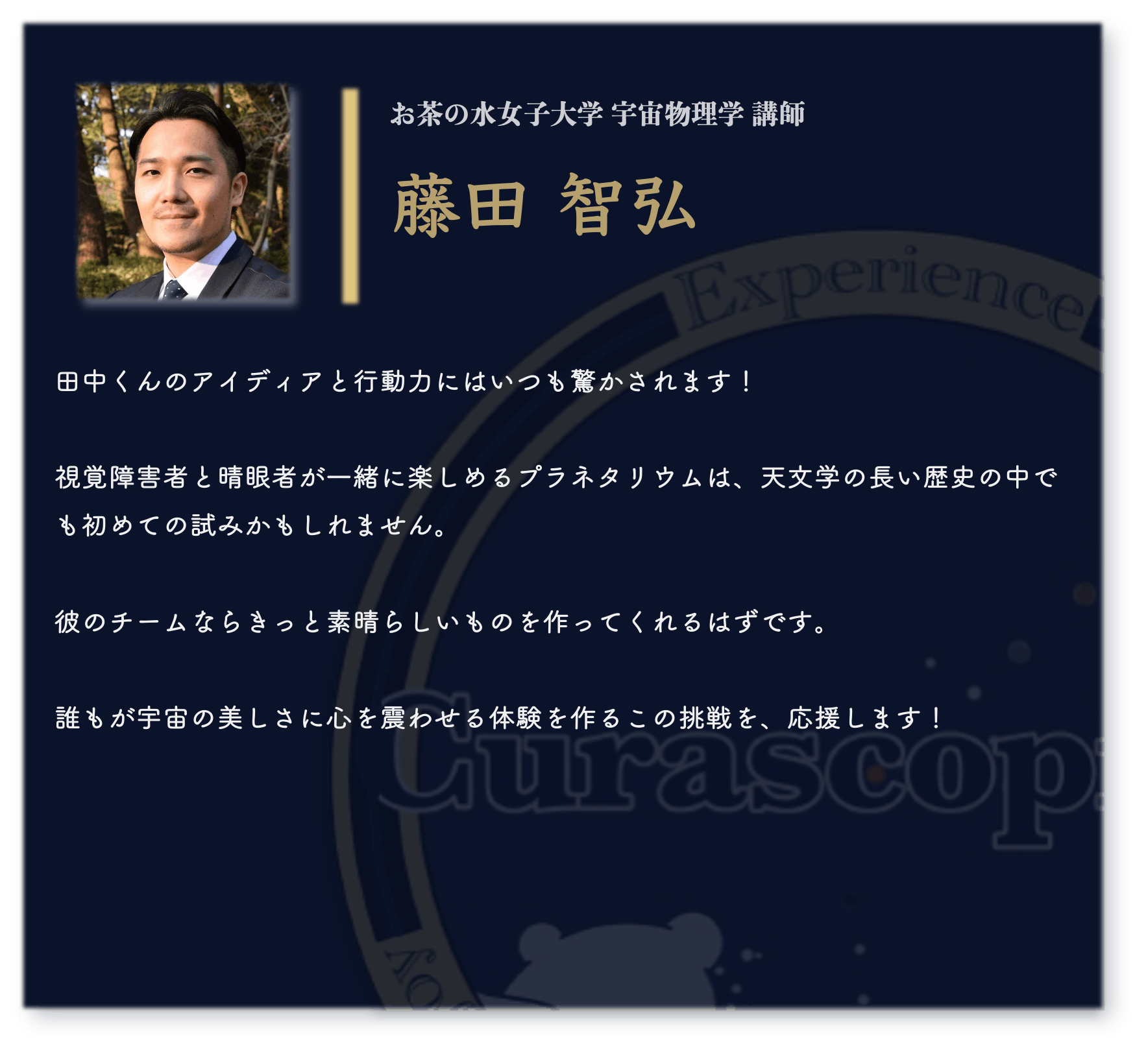 私たちが目指すのは、視覚障がい者と晴眼者が共に感動を共有できる「次世代型プラネタリウム」です。このプラネタリウムでは、視覚情報に頼らず、音や言葉の力を駆使して宇宙を体験することができます。その中でも特に注目していただきたいのが、「宇宙のサウンドスケープ」です。 なお、このプラネタリウムのプロジェクトリーダーを、弊団体理事の張原宏光が務めます。彼は今、ケンブリッジ大学大学院博士課程にて幹細胞生命科学の研究をしています。