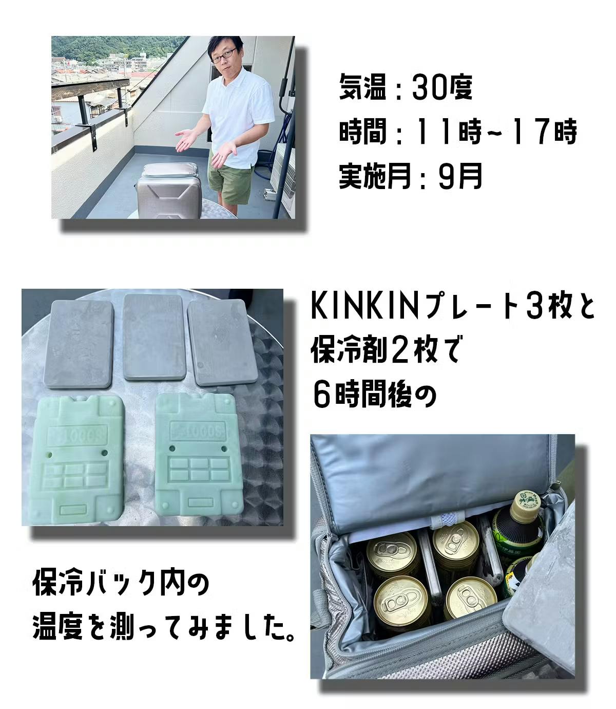 私たちは、通常の保冷剤とKINKINプレートで30度の屋外にて、同じ条件のもと、6時間後の保冷温度の比較の実験を実際にしました。