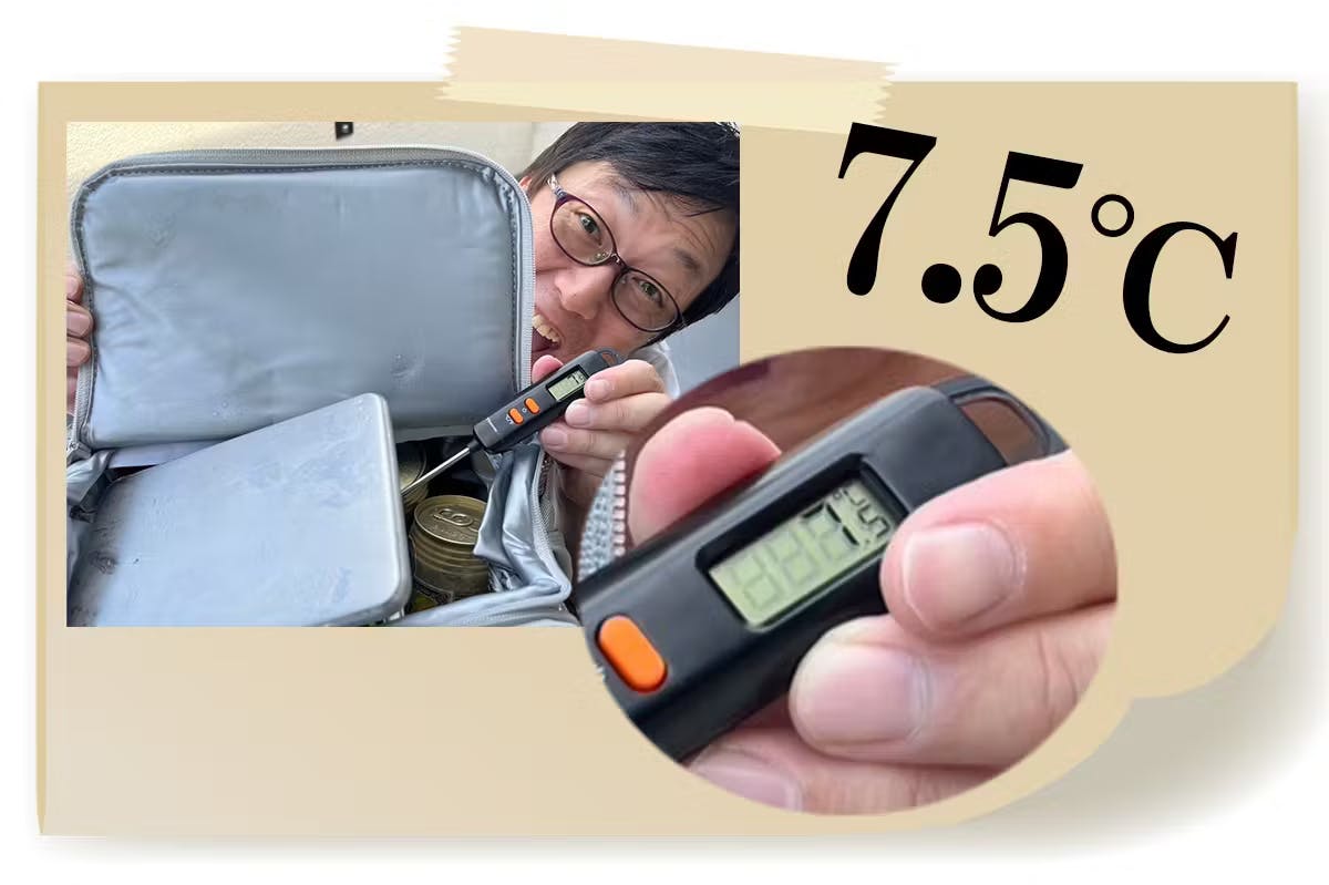開けてみると、保冷剤はだいぶ溶けていました。保冷バック内に温度計を差し込み、温度を測ってみると、14.8℃。