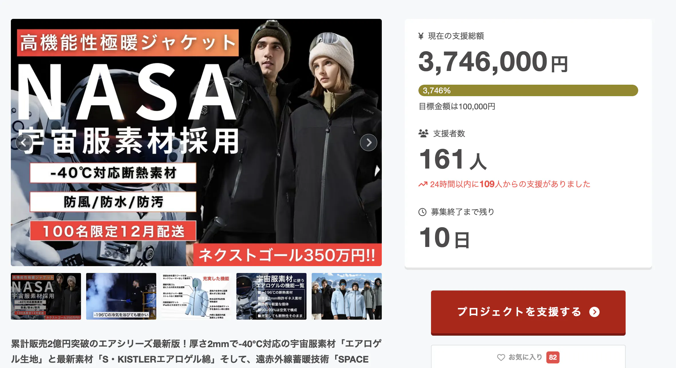 この度は超極暖ジャケット「WARM JACKET V1 」に多大なるご支援をいただき、誠にありがとうございます。皆様のお力添えのおかげで、プロジェクトの目標金額に対して3700%を超えるご支援を達成することができました!