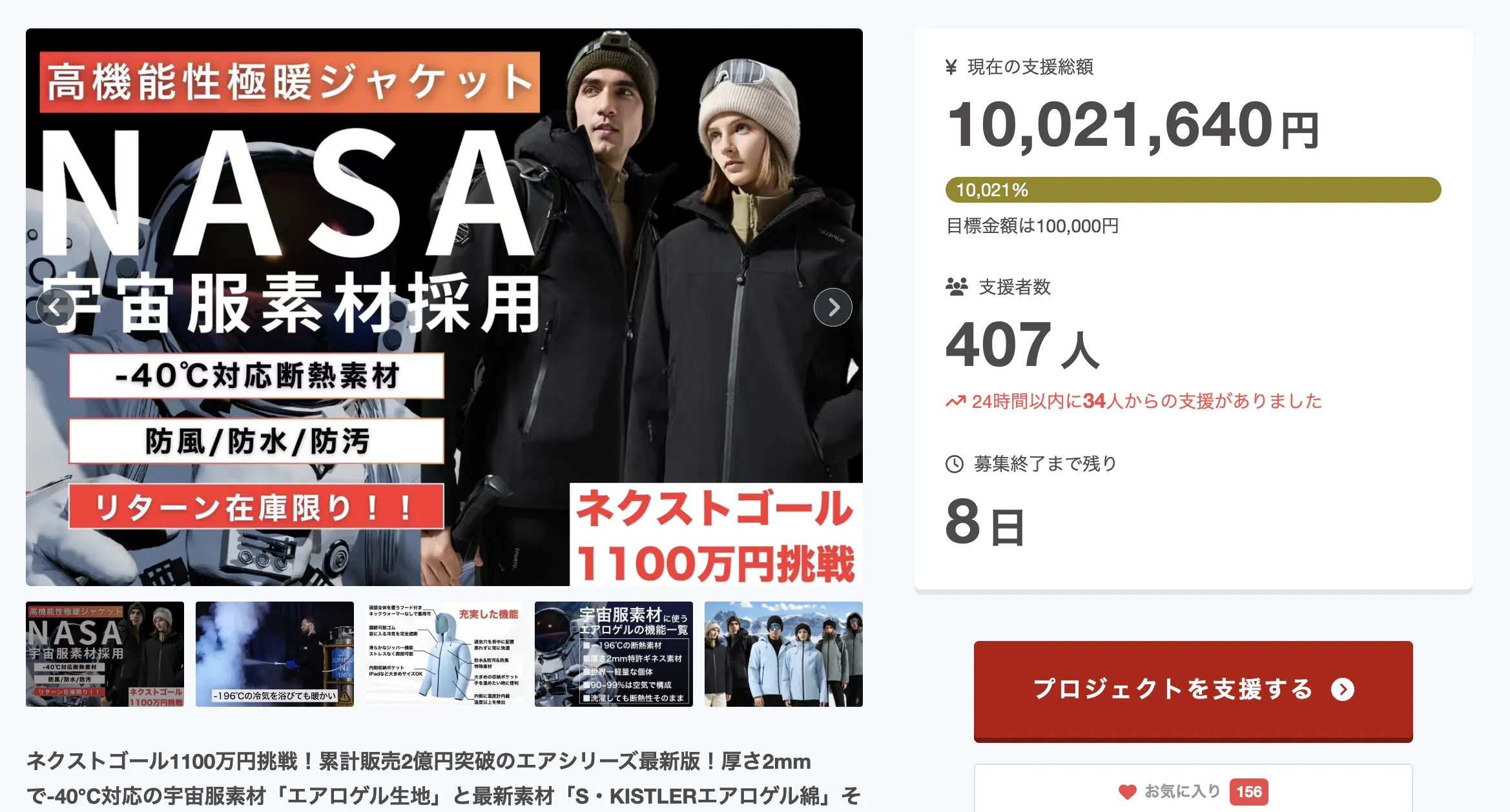 この度は超極暖ジャケット「WARM JACKET V1 」に多大なるご支援をいただき、誠にありがとうございます。皆様のお力添えのおかげで、ついに1000万円を超えるご支援を達成することができました!!