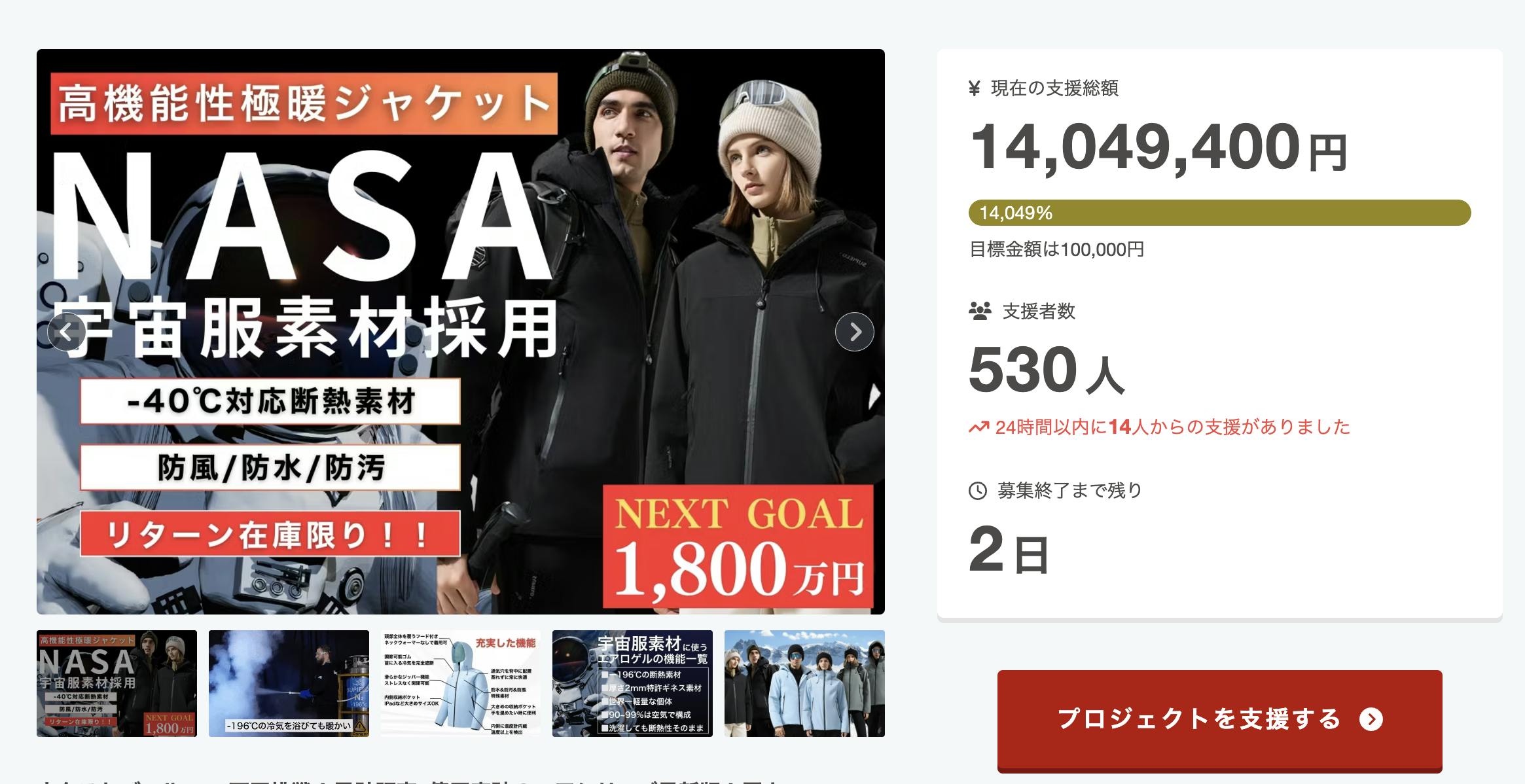 この度は超極暖ジャケット「WARM JACKET V1 」に多大なるご支援をいただき、誠にありがとうございます。皆様のお力添えのおかげで、1400万円を超えるご支援を達成することができました!!