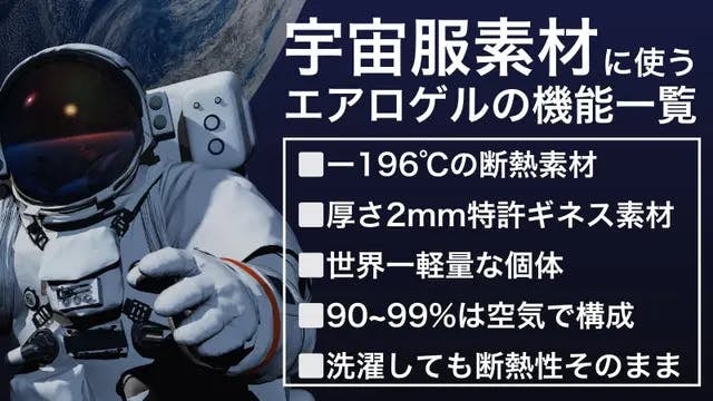 非常に軽く、断熱性の高い「エアロゲル」は、その断熱性の高さから過酷な環境で着用する”宇宙服”にも使われている素材で、-196℃の冷気も断熱できます。