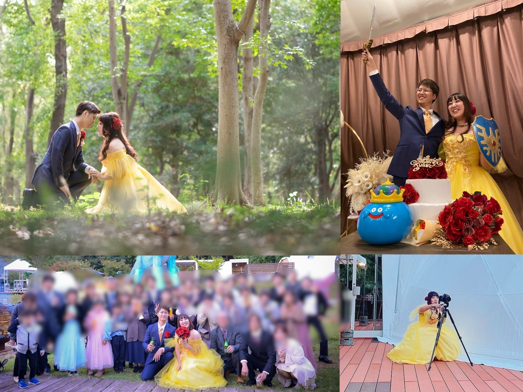 ▲美女と野獣風前撮り&ロトのつるぎで入刀!集合写真は花嫁撮影!久美浜のグランピング施設にてアットホームな結婚式を行ったのはもう3年前…