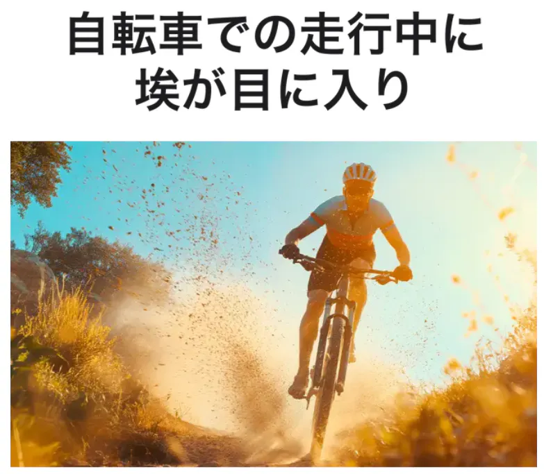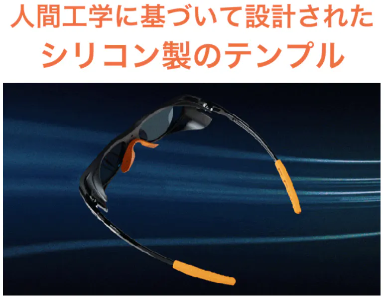 目全体を覆うようなフォルムにより、風や砂の侵入を防ぎます。