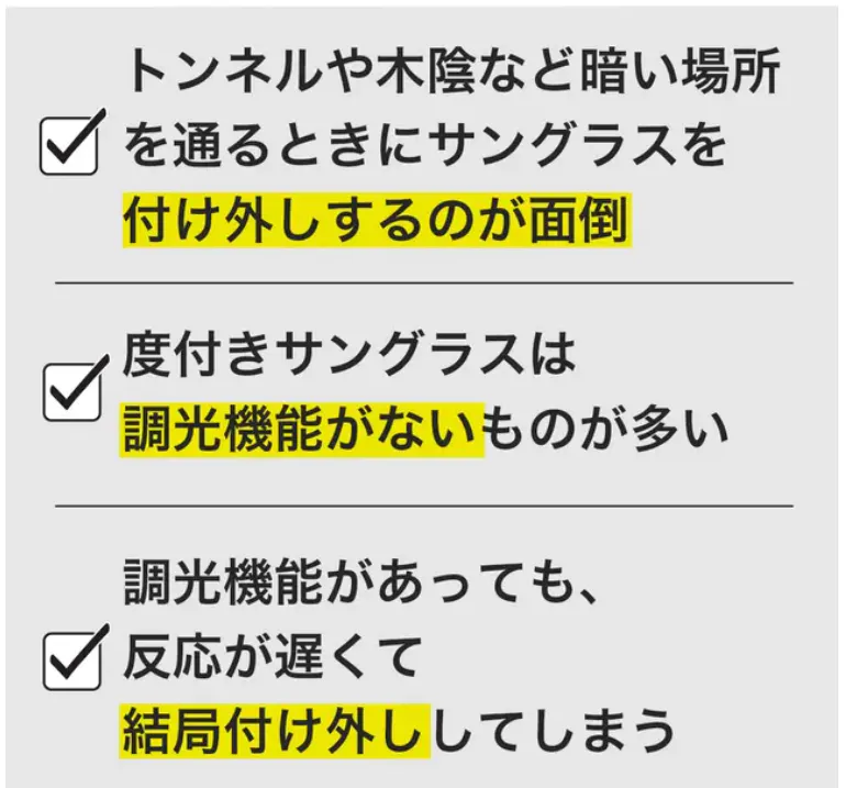 私たちは10年間にわたる研究開発を経て、「明るさに応じて瞬間的に色が変わる」という革新的なサングラスを生み出しました。