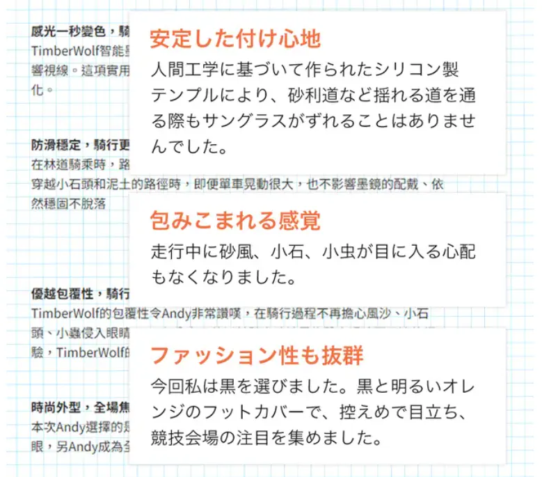 このサングラスを最初に手にした時、その高級感と軽さに魅了され、一瞬で色が変わる「瞬間調光機能」は本当に感動で、家族や友人にも共有したくなるクセになる商品です。ドライブやサイクリングだけでなく愛犬との散歩時にも重宝しています。