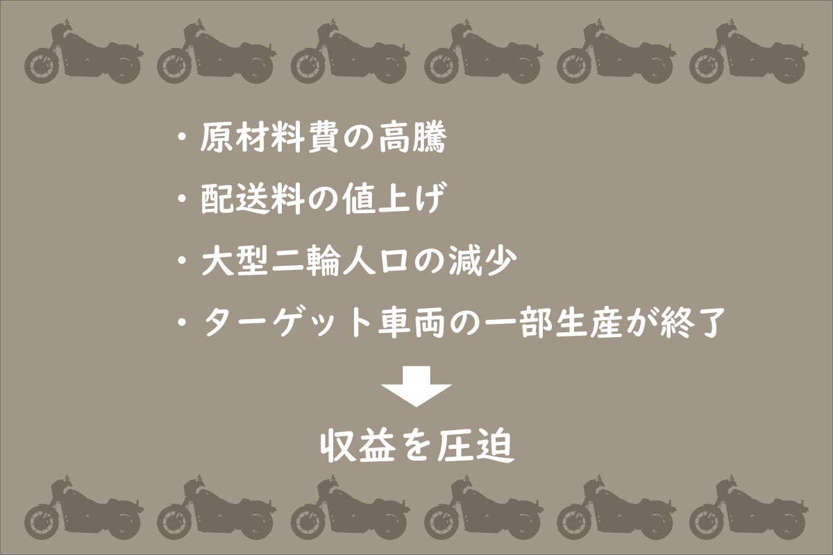 円安による原材料費の高騰。配送料の値上げ。大型二輪人口の減少。