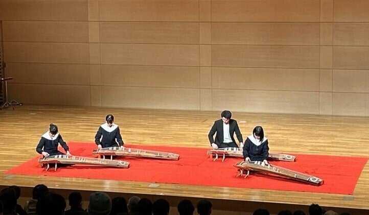 松高生が、駅前で、巨大な紙に書道をするパフォーマンスを披露します