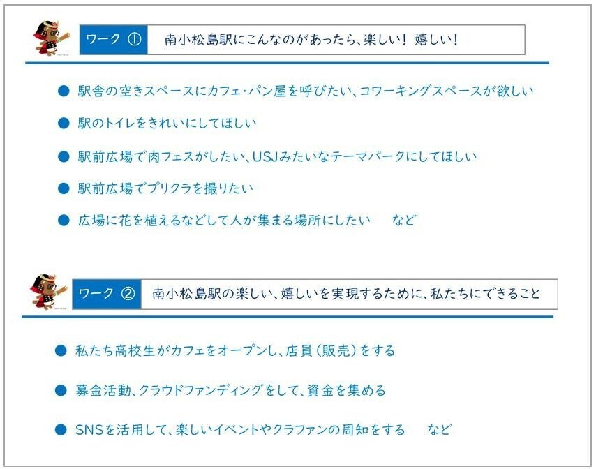 そして、私たちは「南小松島駅にこんなのがあったら、楽しい! 嬉しい!」「南小松島駅の楽しい、嬉しいを実現するために、私たちにできること」をテーマに、グループワークを行いました。
