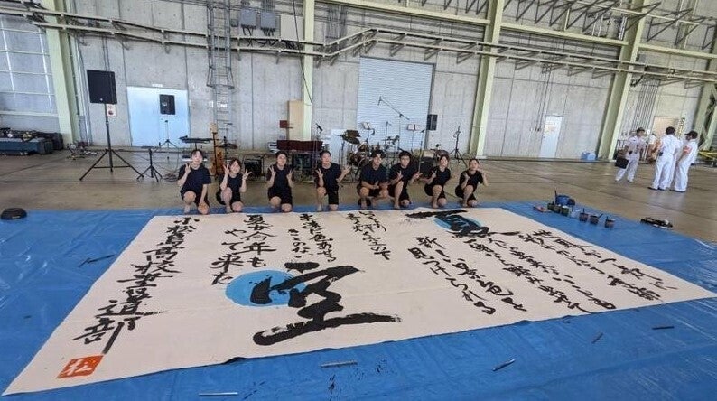 松高生が、駅前で、巨大な紙に書道をするパフォーマンスを披露します