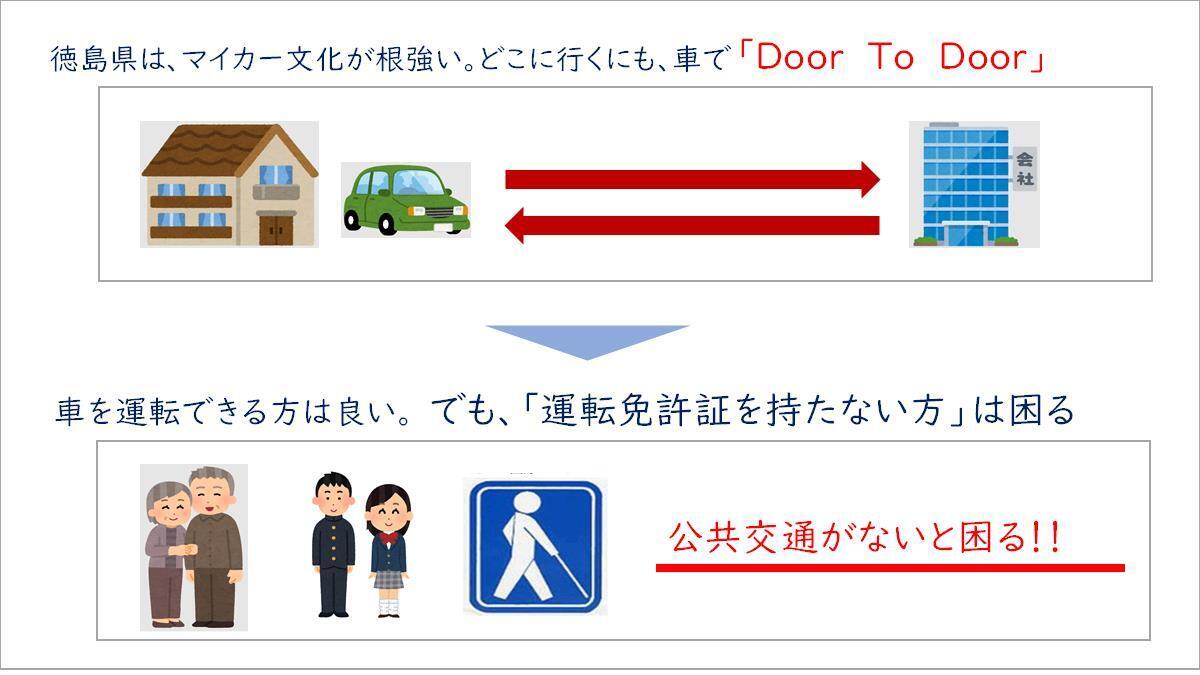 徳島県はマイカー文化が根強く、どこに行くにも、車で「Door to Door」です。