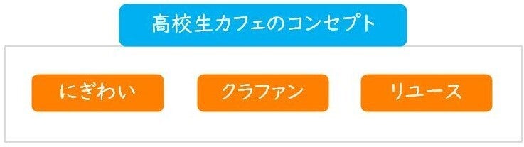 私たちが考えた高校生カフェのコンセプトは、「にぎわい」「クラウドファンディング」「リユース」です。