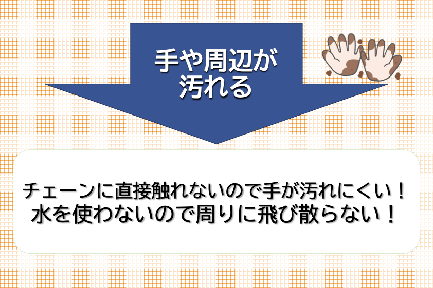 液体洗剤を使用した場合、従来の方法ではウエスを手で持ちチェーンにあてがうので手が汚れがちです。このチェーンクリーニングブレードでは、ウエスで本体部分を覆うので、手を汚さずにチェーン清掃を仕上げられます。