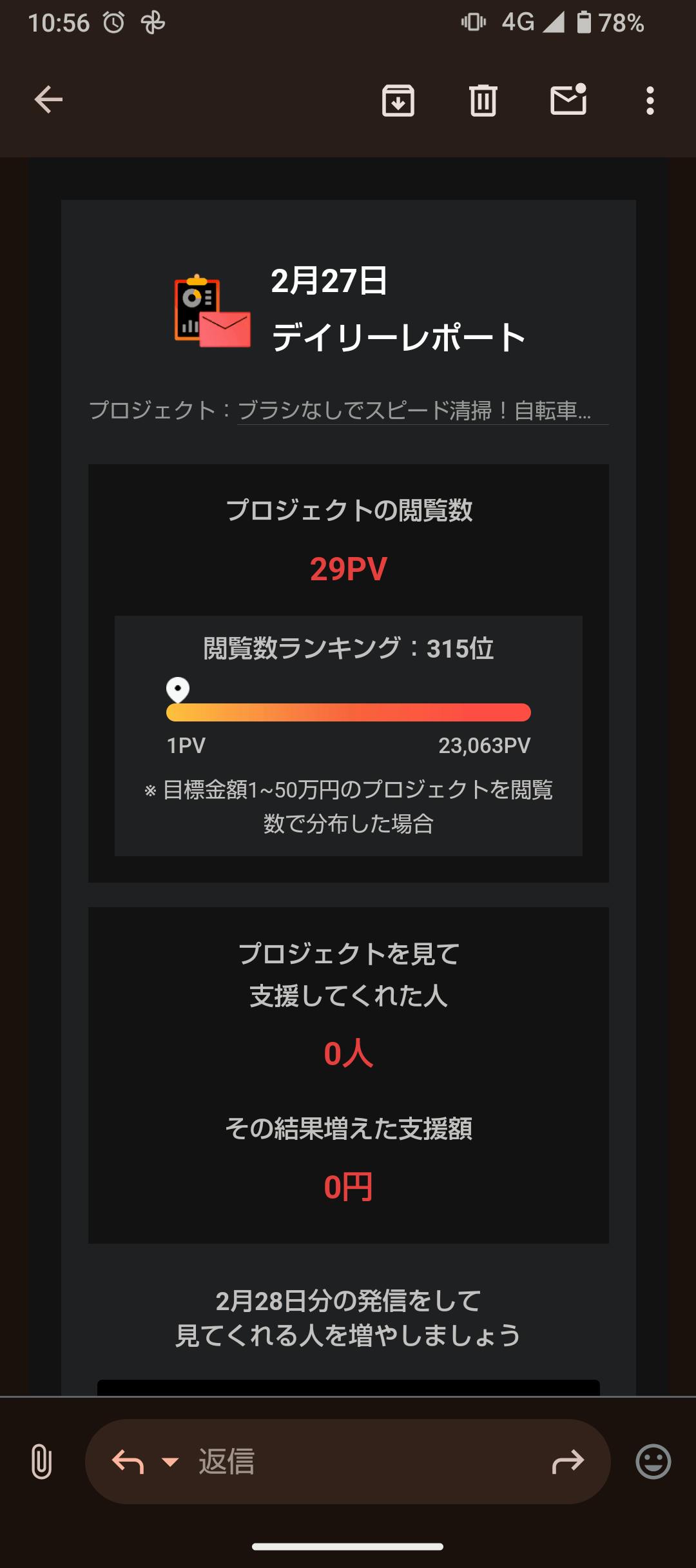 2025/02/28 11:34写真は当クラファンページが、1日に何回見てもらえたかを毎朝メールで届くのですが、そのスクショです。ついにはPVがフォロワー400人ほどのX(Twitter)の弱小アカウントの私がたまに呟いた時のインプレッションまで落ちました(苦笑)そんな現実も、実際にクラファンを経験することで認識できたのでやってよかったなぁと思っています。やれるコトと、やれそうだがやれそうでないコトはなかなか判別することはできません。今回それが分かったので、自分の出来る範囲で、確実にやれることにリソースを集中して、後悔ないように活動を続けたいと思ってます。少ない人数ながらも支援してくれた方には、今後考えてる新たな方法で、チェーンクリーニングブレードをお届けできる事が可能になる予定なので。もうしばらくお待ちください。ここまでお付き合いいただいた方には改めてお礼申し上げます。ありがとうございました! もっと見るスポニチ九州版に掲載しました!