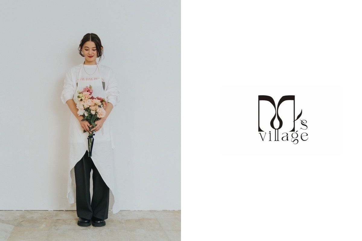 左:農産物のトルコ桔梗とオリジナルエプロン/右:M’s villageロゴ