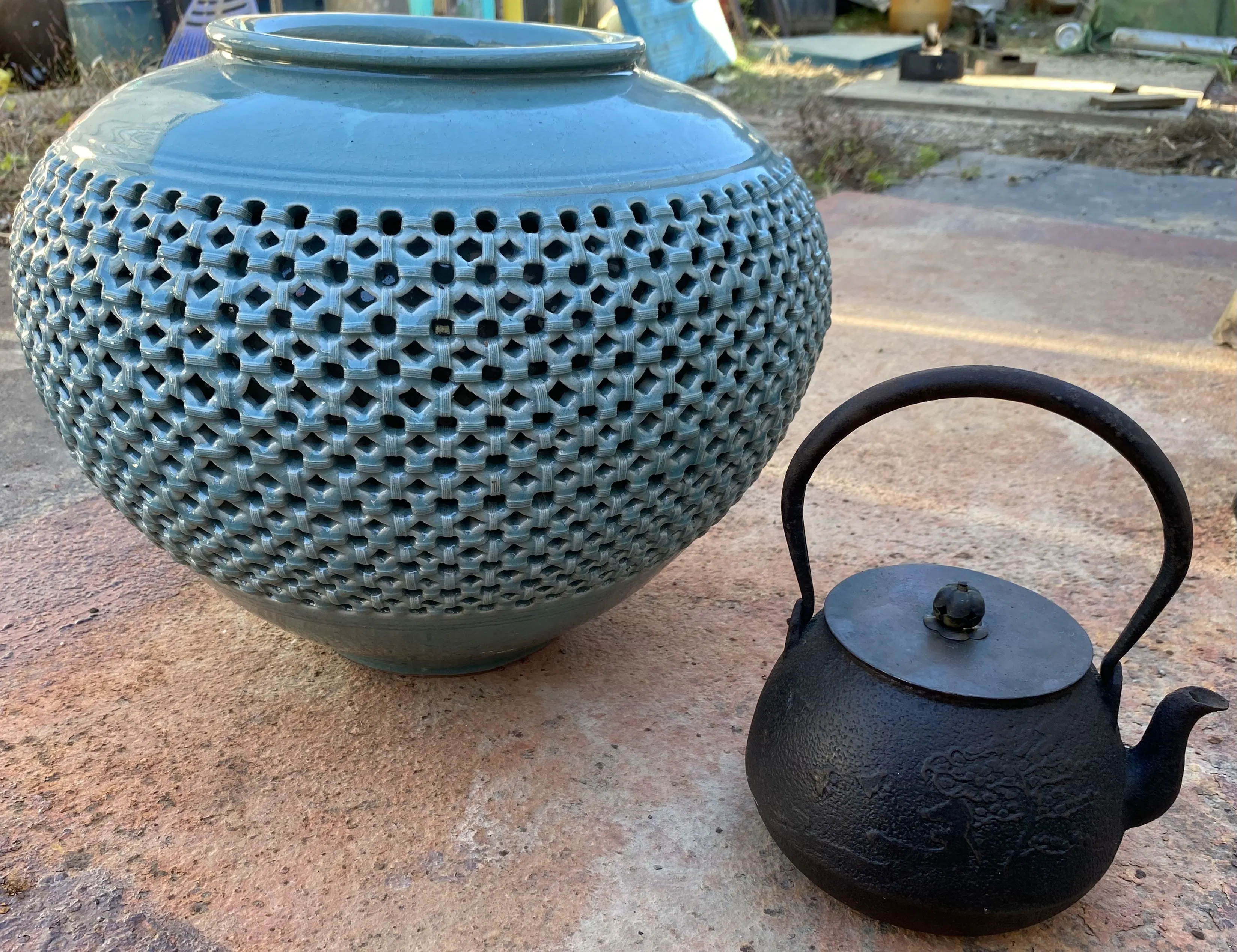 韓国高麗青磁の壺と南部鉄器の鉄瓶