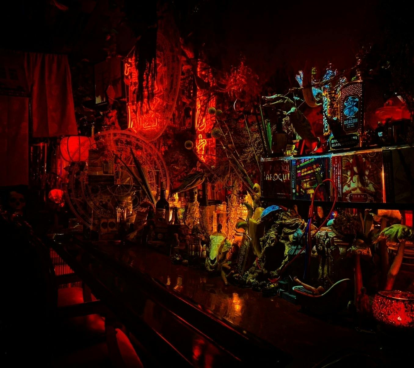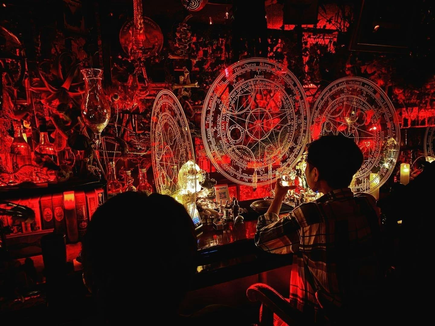 また館内には「禁忌ノ美術處」として、呪(まじな)われたアーティファクトやミステリアスなアート作品が常時展示されており、まるで美術館のような空間でオカルトや幻想的なインスピレーションに浸ることができます。当館の館主もアーテイストとして活動していた時期もあり飲食店バーという形式だけでなく、多種多様な表現の場、そして新しい繋がりを生む交流の場としても、たくさんの方々の思い出が残る空間であります。年齢層も20代~70代と幅広く(主に40、50代のお客様がほとんどですが、中には保護者連れのお子様まで)ご来館いただいております。近年では、当館で出会ったアーティスト同士がご結婚されたり、仕事に向上・出世されたりしております。