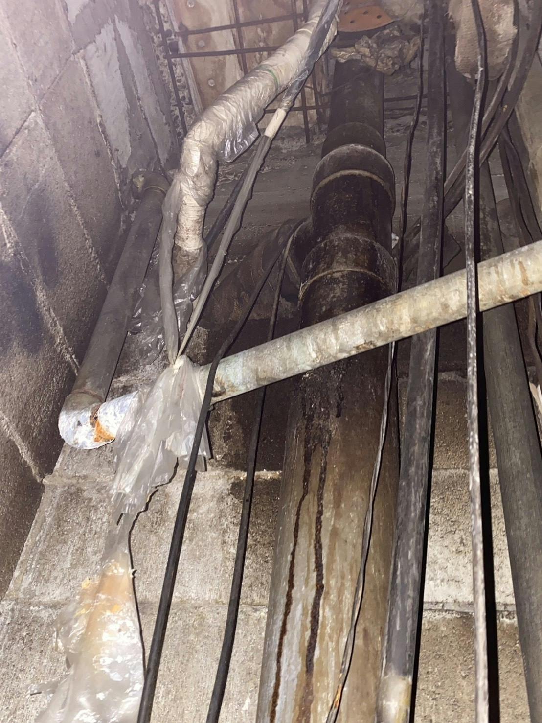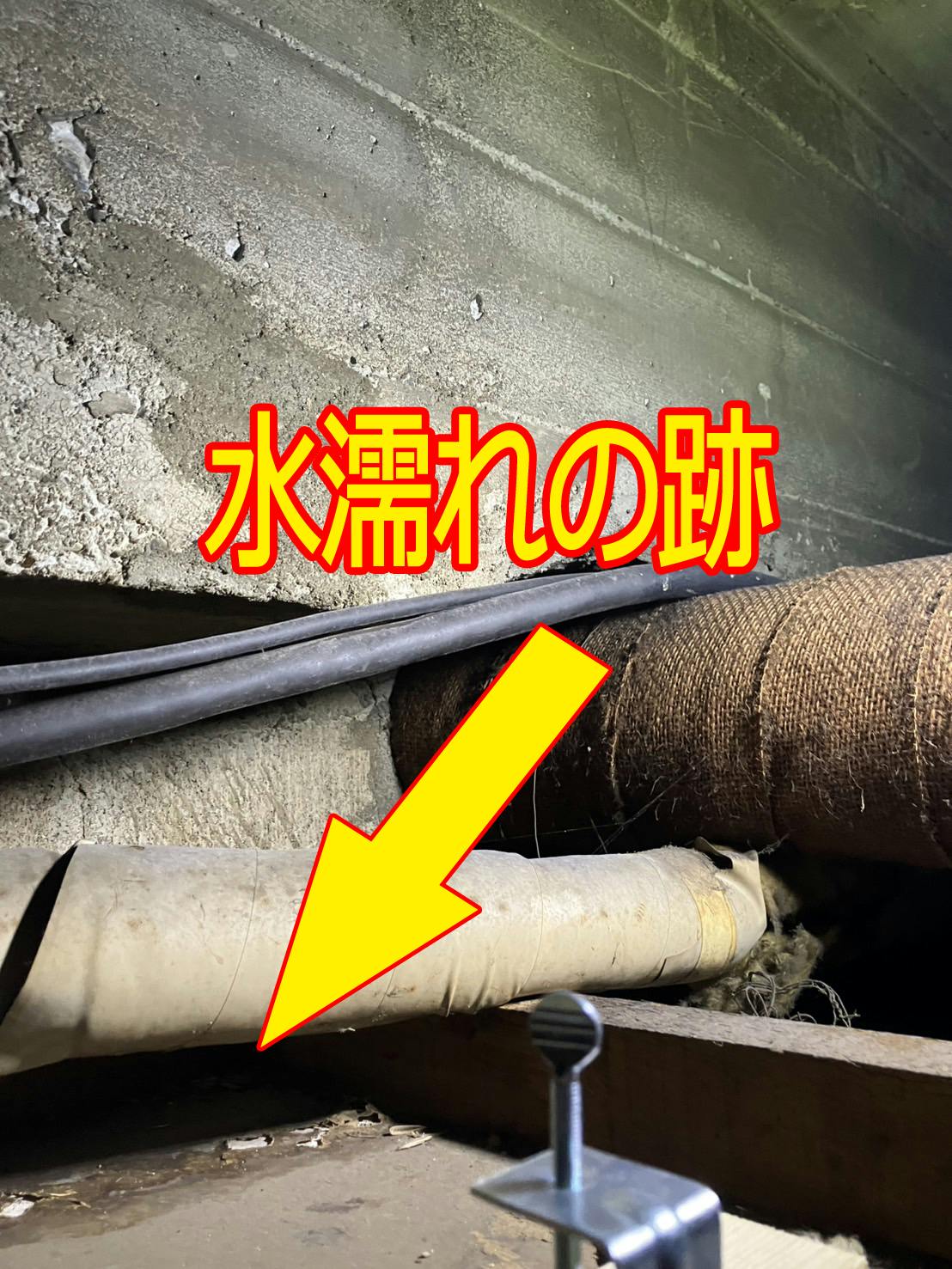 ※状況を調査したところ。館内を通るエアコン関係の配管は、建設当時よりあったもので複雑な設置をしていました。原因と思われる部分をビニルで補強し耐え凌いでいる現状です。しかし、今夏を乗り超えることは厳しそうです。汗