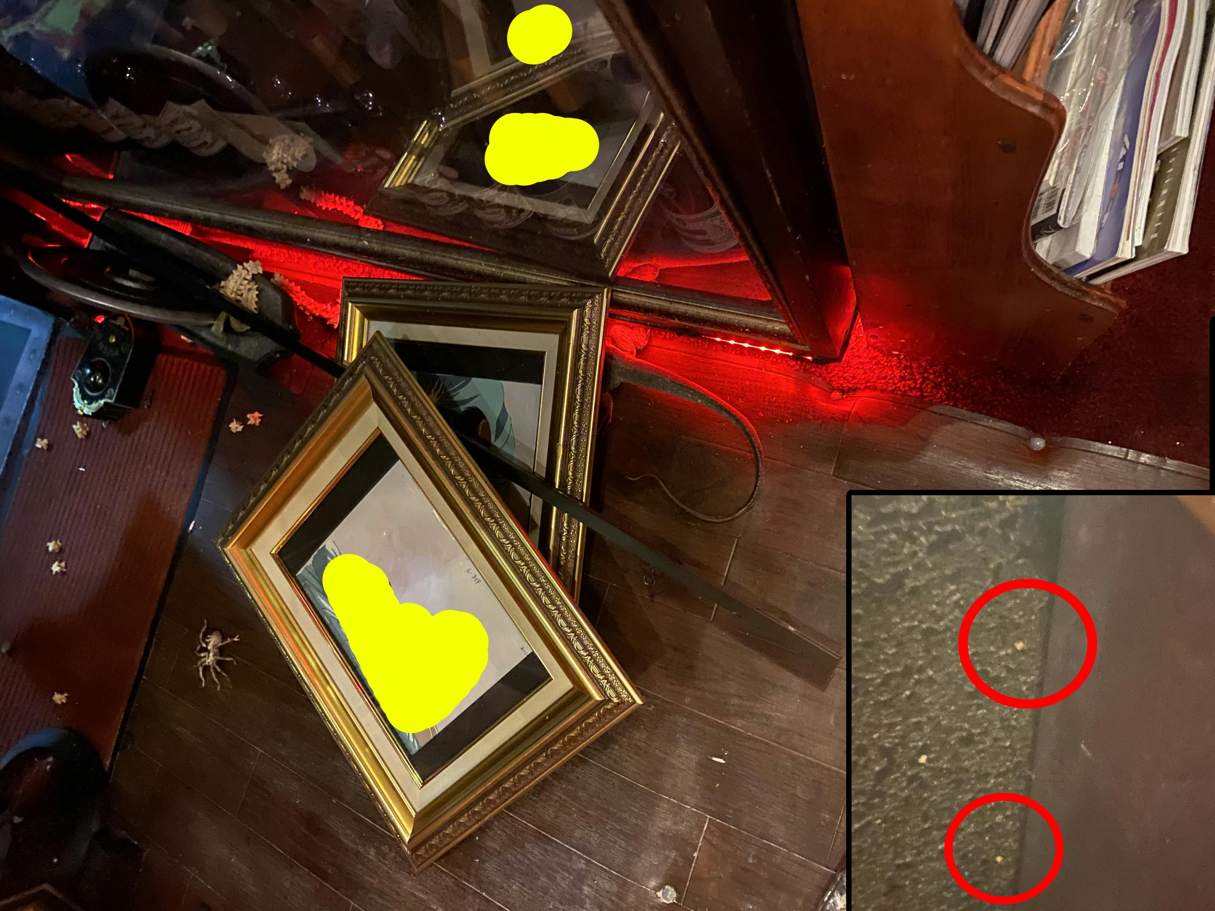 ※真ん中付近の黒い棒が落下したレールで、赤〇部分が、レールのネジ痕です。