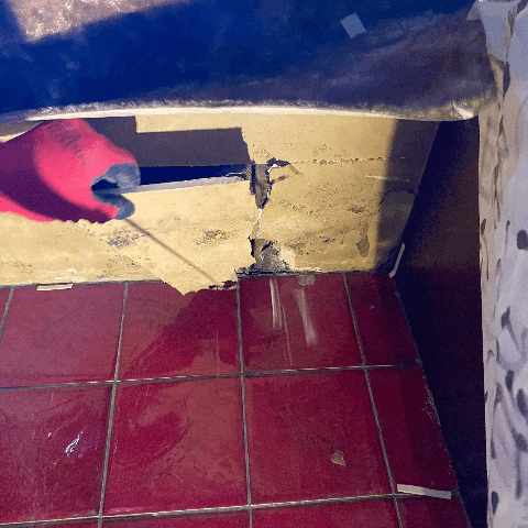 ※壁紙をめくるとカビが侵食しており、指で押さえると腐敗して穴が開く状態です。さらに状況確認の為、天井裏の一部を破壊。ボロボロに朽ち果て痛んでいることがわかりました。
