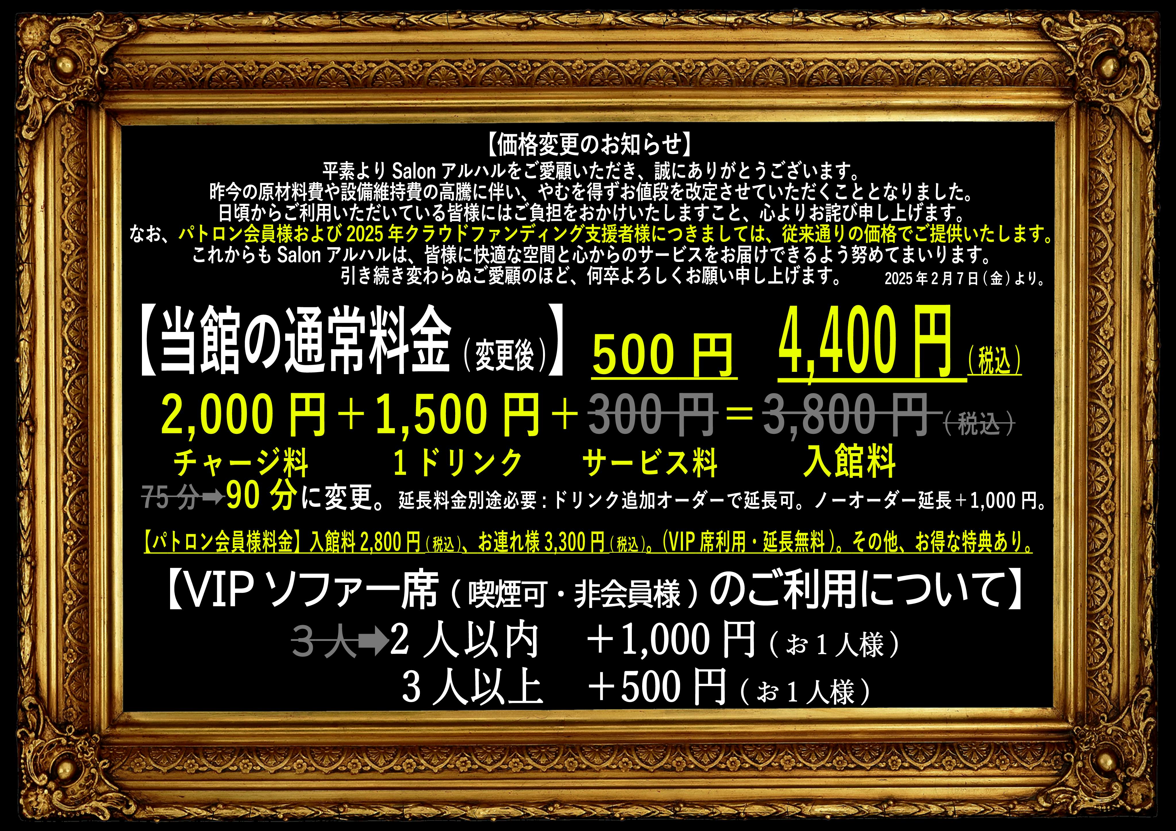昨今の原材料費や設備維持費の高騰に伴い、やむを得ず2025年2月7日より、一部メニューのお値段を改定させていただくこととなりました。日頃からご利用いただいている皆様にはご負担をおかけいたしますこと、心よりお詫び申し上げます。なお、パトロン会員様および本クラウドファンディング支援者様につきましては、従来通りの価格でご提供いたします。これからもSalonアルハルは、皆様に快適な空間と心からのサービスをお届けできるよう努めてまいります。引き続き変わらぬご愛顧のほど、何卒よろしくお願い申し上げます。※パトロン会員様を除く本クラウドファンディング支援者様の従来価額適応は、2026年3月31日迄。1年以内となります。