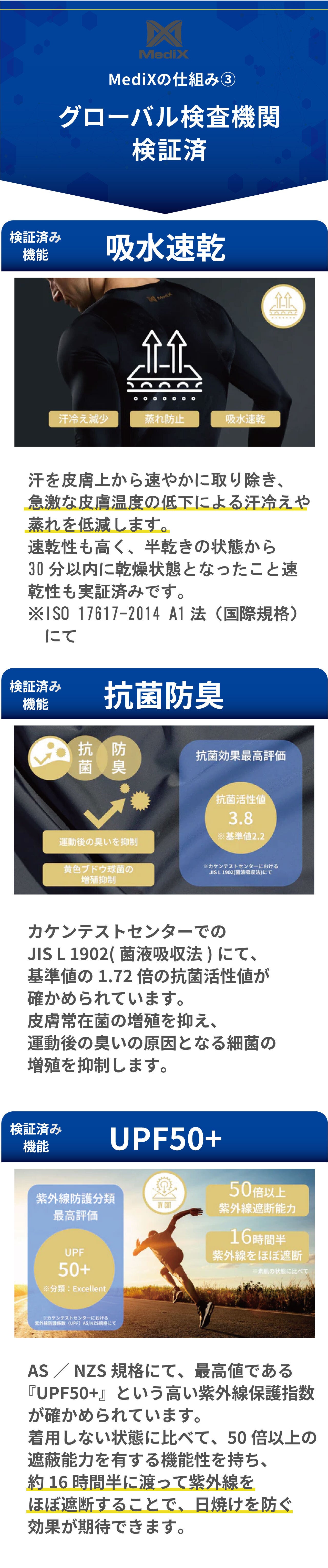 そのため、脱着時にはウェアを引っ張る動作が必要になることがありますが、これはサイズが小さいわけではなく、シャツの特性上、自然と必要となる作業です。着用後は筋肉や体の動きに合わせて伸び縮みするため、動きが制限されることはありません。ご安心の上、ご使用ください。