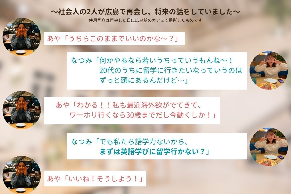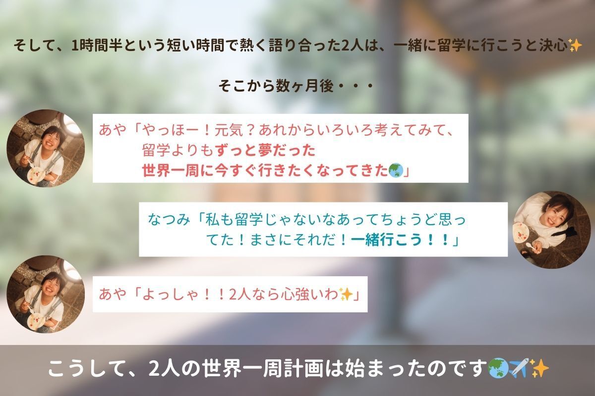 昔から新婚旅行で世界一周に行きたいという夢を聞いてはいたものの、なつみはそれまで「へえすごいね!」くらいにしか思っていませんでした。ですがちょうどその時、留学に行く目標をたててから「なんで留学に行きたいのか?」を自分に問いかけたり、周りから「留学!?いいね!どこの国に行く予定なの?」と聞かれたりする中で、なんだかもやもやしている日々を過ごしていました。