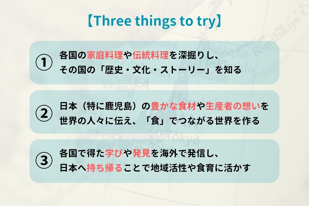 鹿児島の豊かな食材や、生産者の想いを世界の人々に伝えることで、食を通じた新しいつながりを生み出し、鹿児島の可能性を広げる挑戦にしたいです!!
