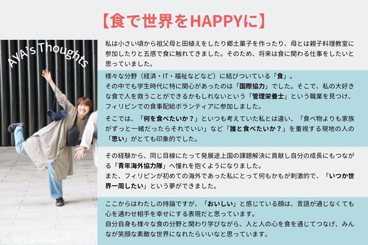 私たちも、彼らのように「食」を通じて海外で学び、その知見を日本や地域社会に活かしていきたいと考えています。