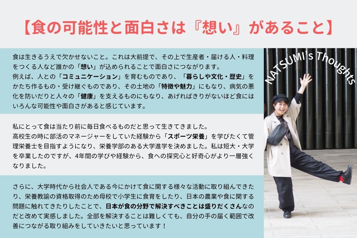 食に興味がある多くの人に、完成された商品をみておいしそうと思うだけではなく、食材を育てる一次産業の方や加工品を作る生産者さんの努力やルーツ・想いを知ってほしいと思い、SNSにて動画を発信することにしました。