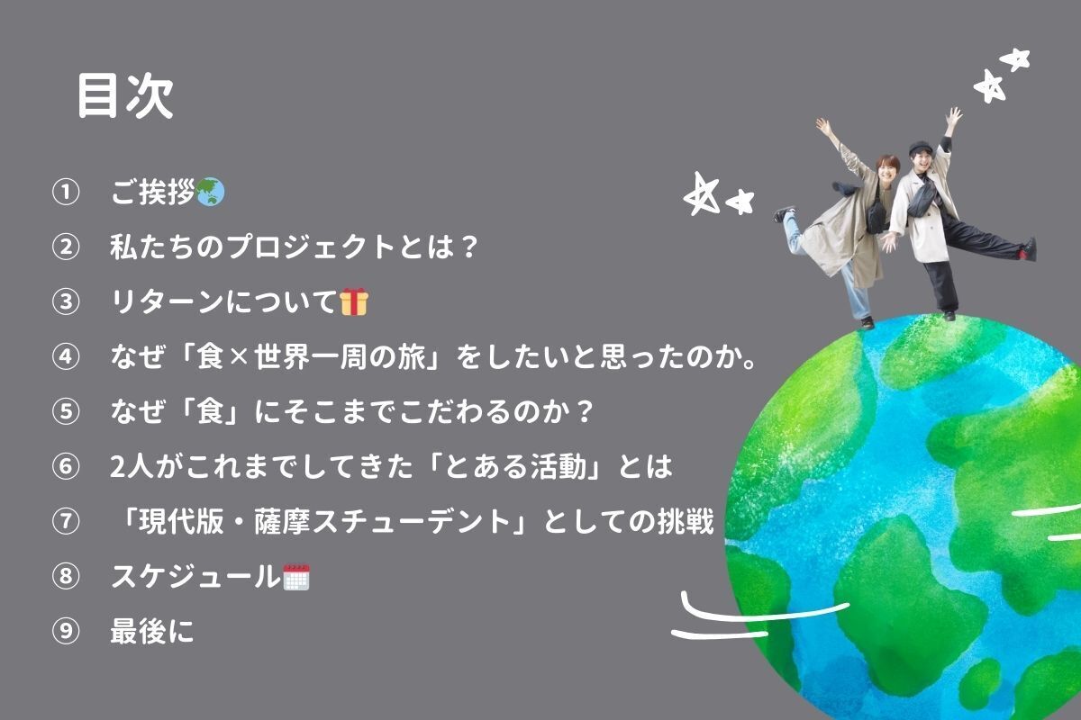 世界一周を通してまだまだ無限に広がっている「食」の可能性を私たちなりに探り、人と人の心を「食」を通じてつなげたいと思います!