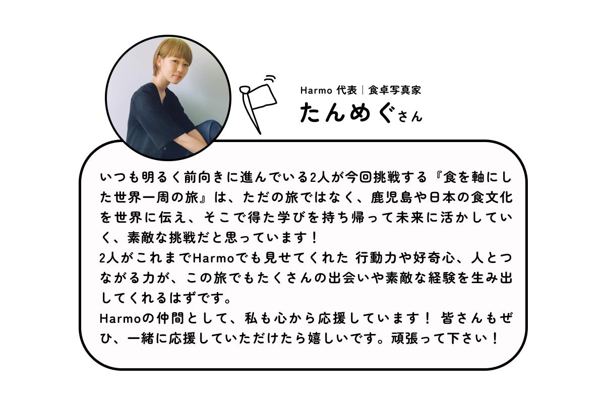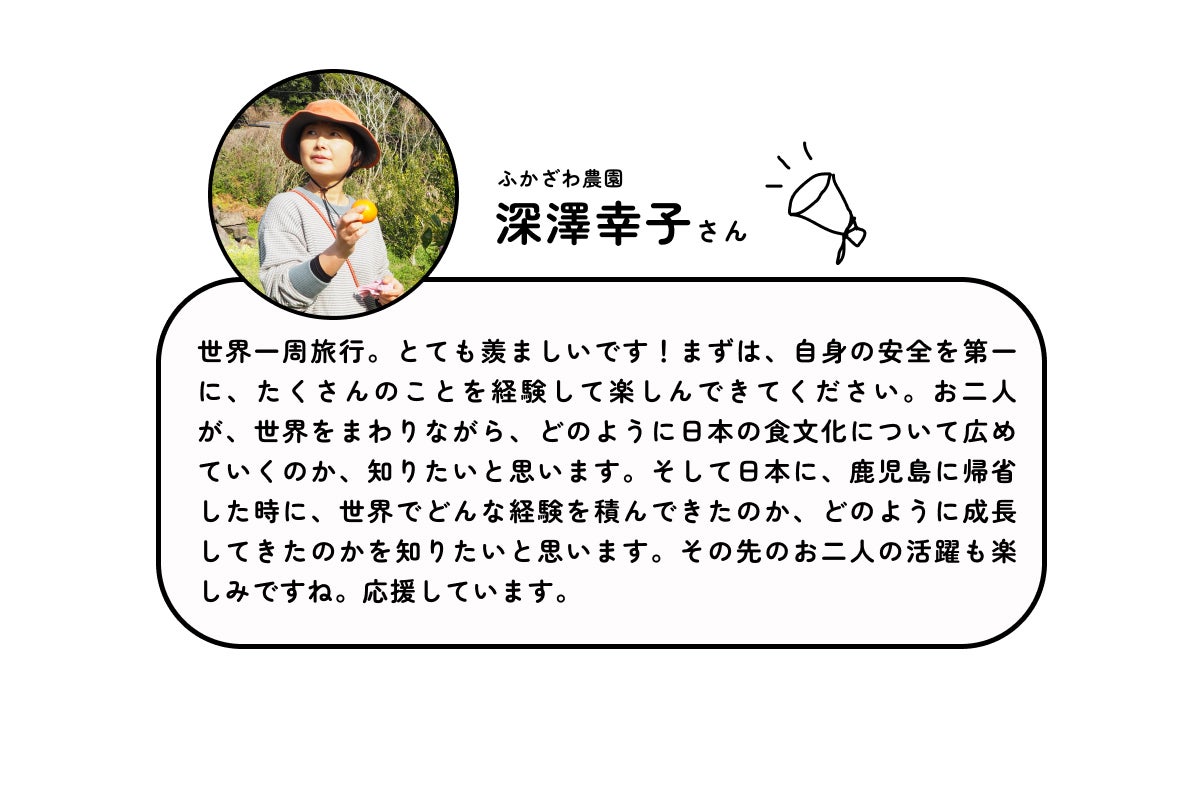 あなたの支援で、鹿児島・日本の食の魅力を世界に広げ、自分たちの成長と旅で得た学びを発信することにより、皆さんにワクワクを伝染させ、ひとりひとりが未来を楽しく描けるような冒険になれたらいいなと思っています。