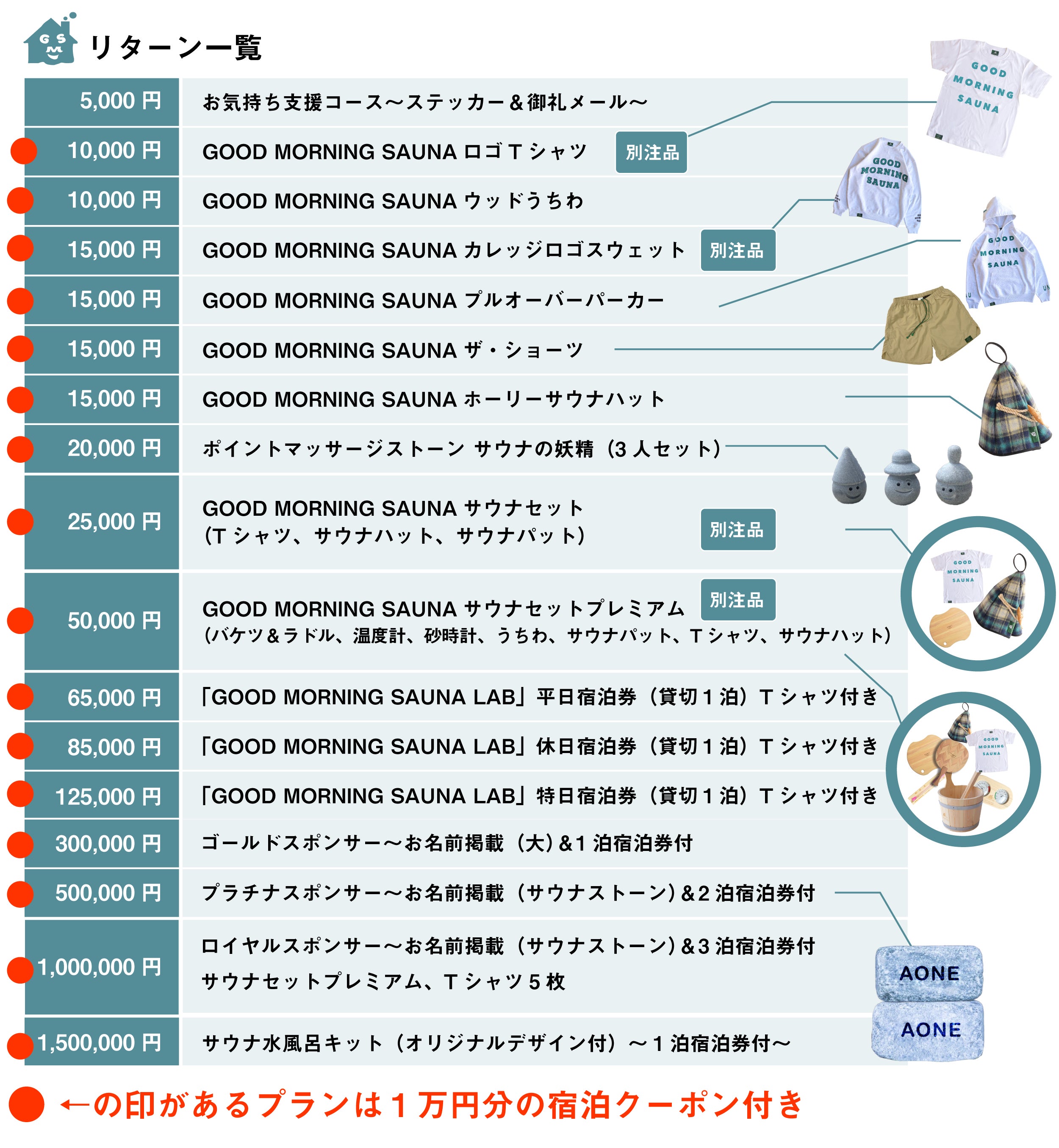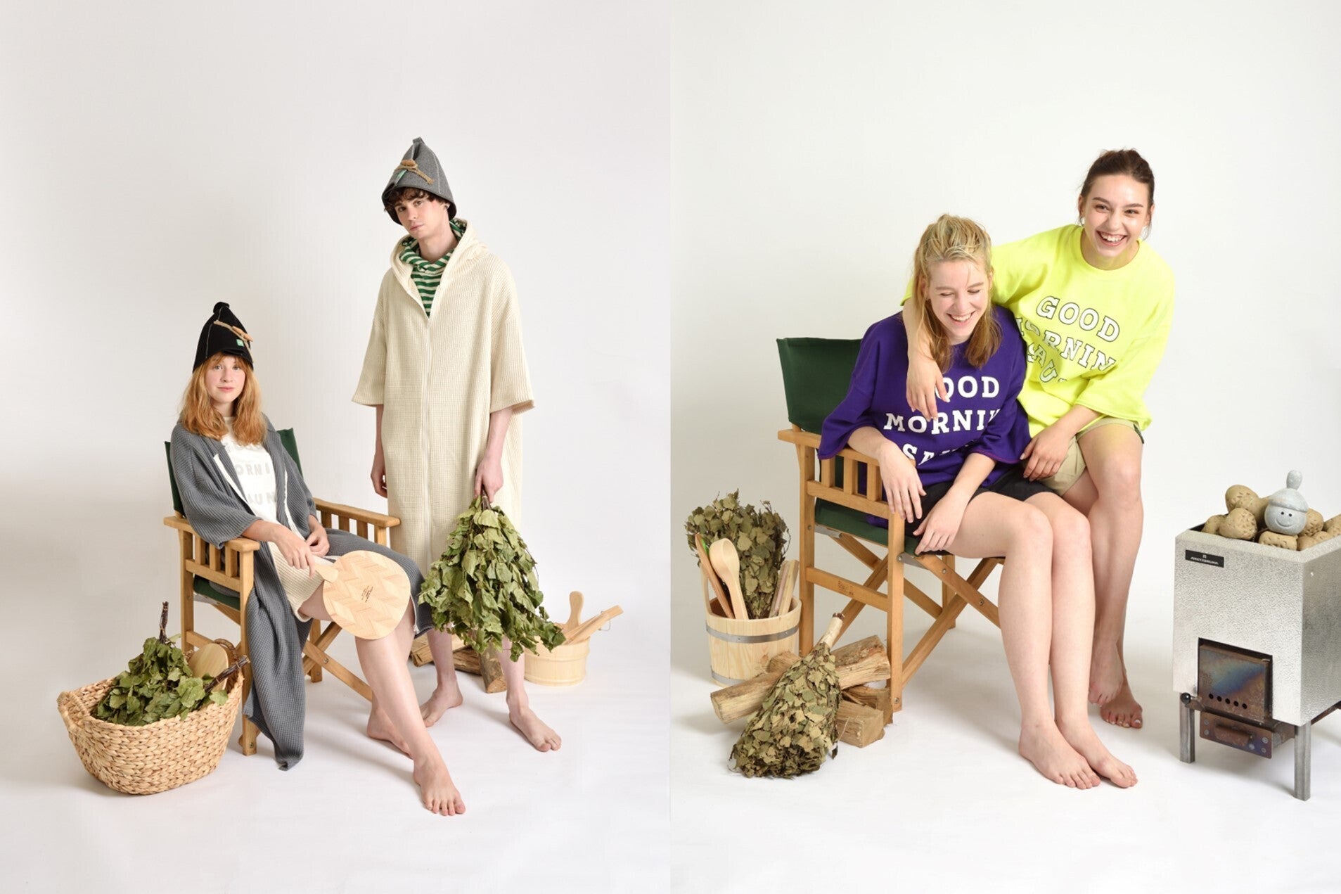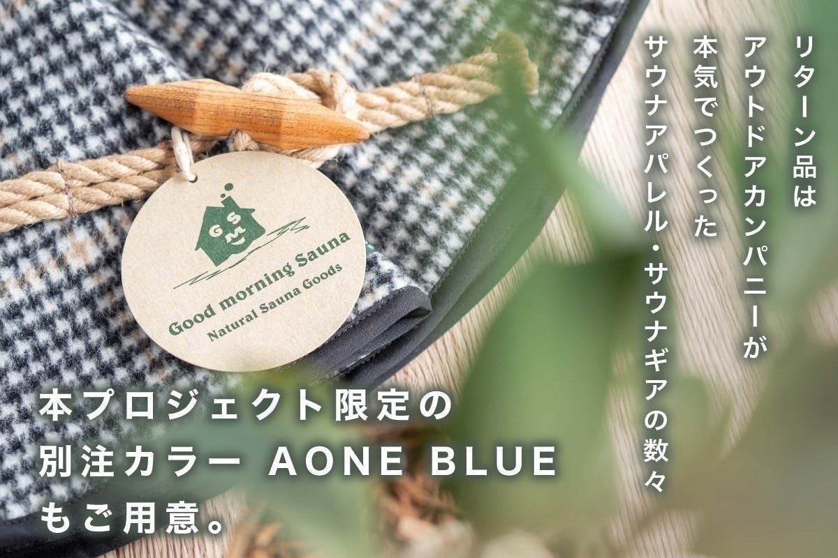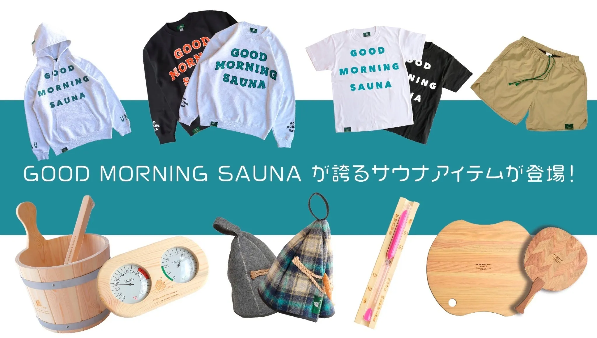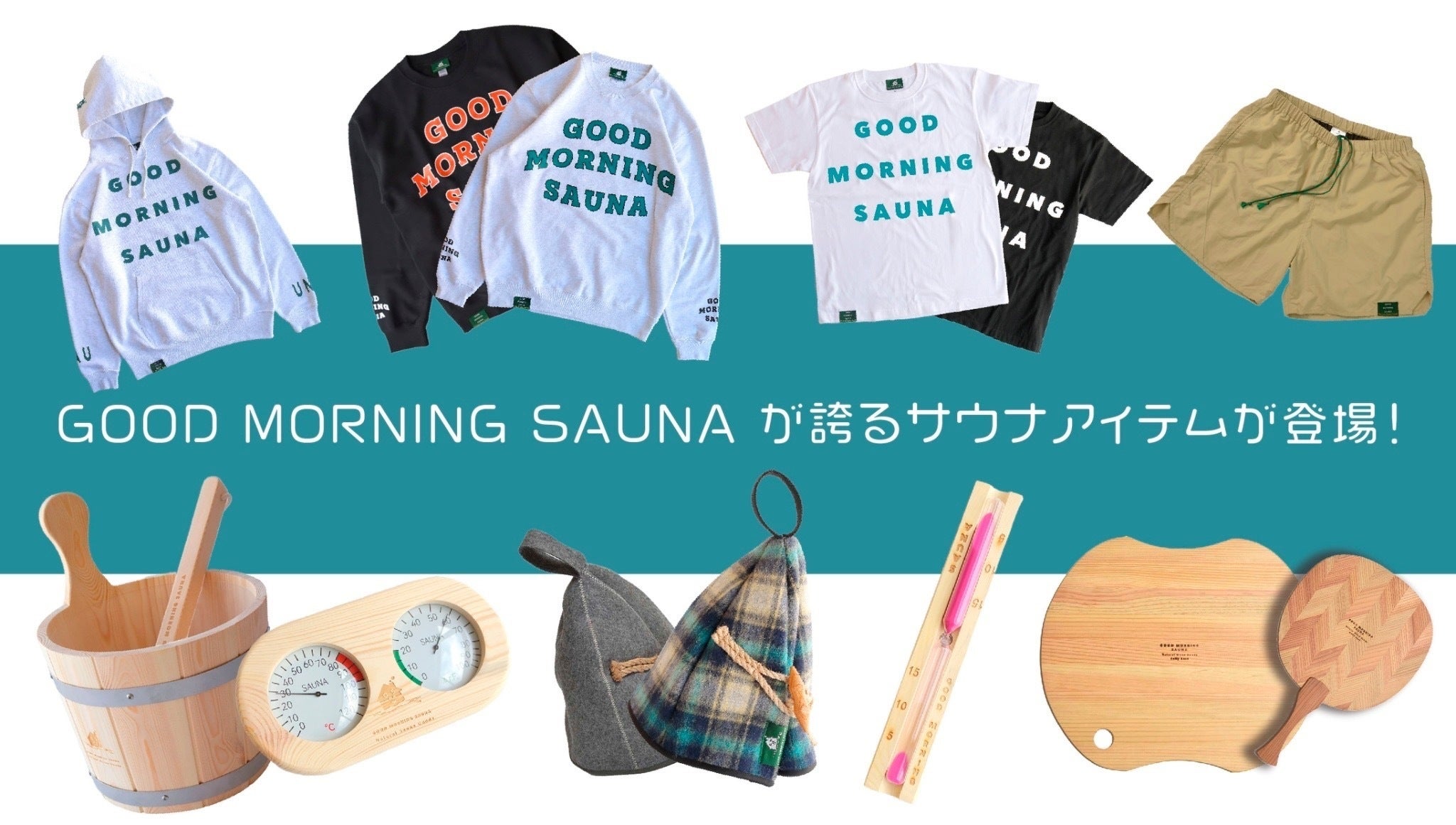 「GOOD MORNING SAUNA」のTシャツ・スウェット・パーカー・サウナハットの別注として、青根をイメージした新カラー「AONE BLUE」をご用意しました。また、うちわ・サウナパット・バケツ・ラドル・温度計・砂時計などを詰め合わせたサウナセットや、コテージの先行予約ができる宿泊券、さらにHUKKA DESIGNのご協力により、サウナの妖精のマッサージストーンや、特別にサウナストーンに好きなお名前を刻印できるプランも実現しました。