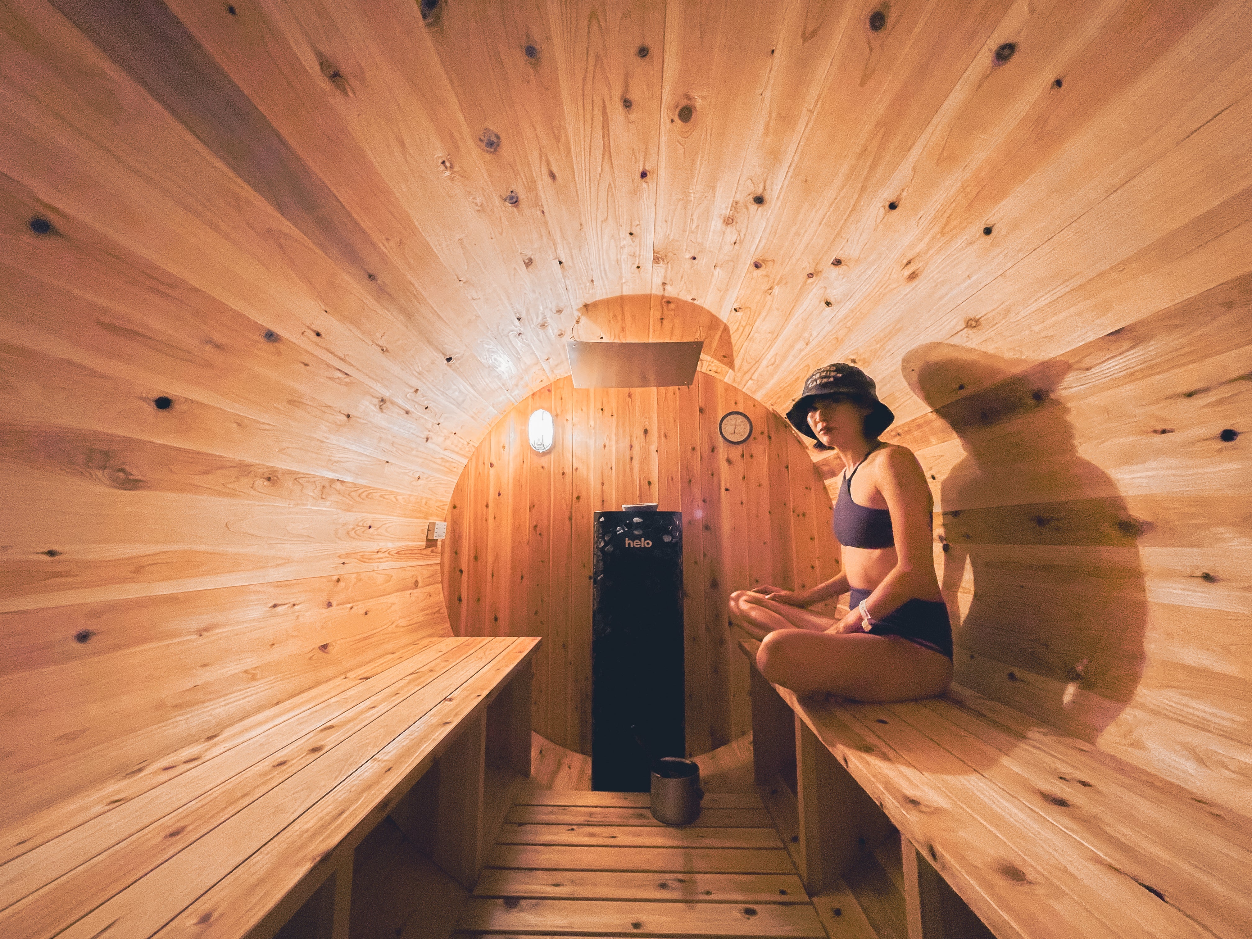 温泉のあとは、宮城の間伐材を使用した本格バレルサウナへ。